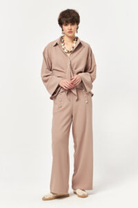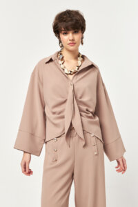 The wide, dropped sleeves with extended cuffs reinforce the relaxed yet elevated character of the design. Crafted from smooth woven fabric, the piece maintains its structure while flowing effortlessly. The beige tone enhances its warm, timeless appeal—ideal for sophisticated everyday styling and coordinated set looks.