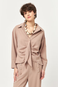 Designed with a fluid drape and sculptural front detailing, Beige Draped Tie Shirt features a refined front tie detail that creates a soft, layered fall across the body.