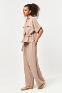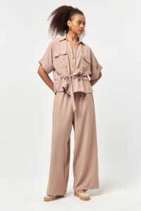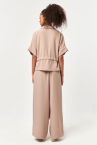 Featuring functional side pockets, the design allows the fabric to fall naturally, enhancing its smooth drape and movement. The beige tone adds a warm, refined character—ideal for effortless styling and elevated casual looks.