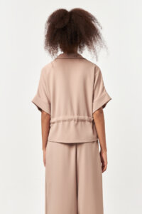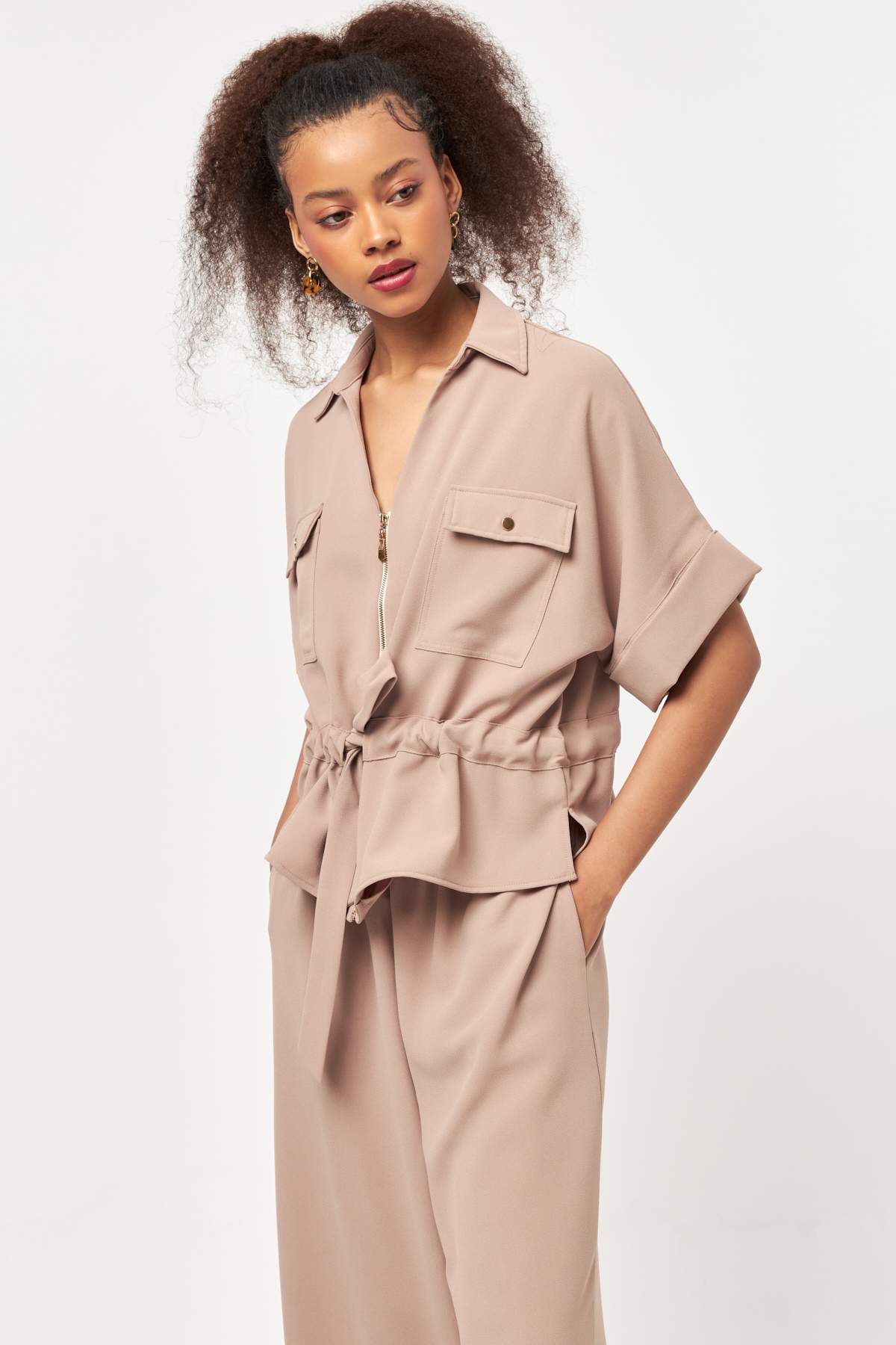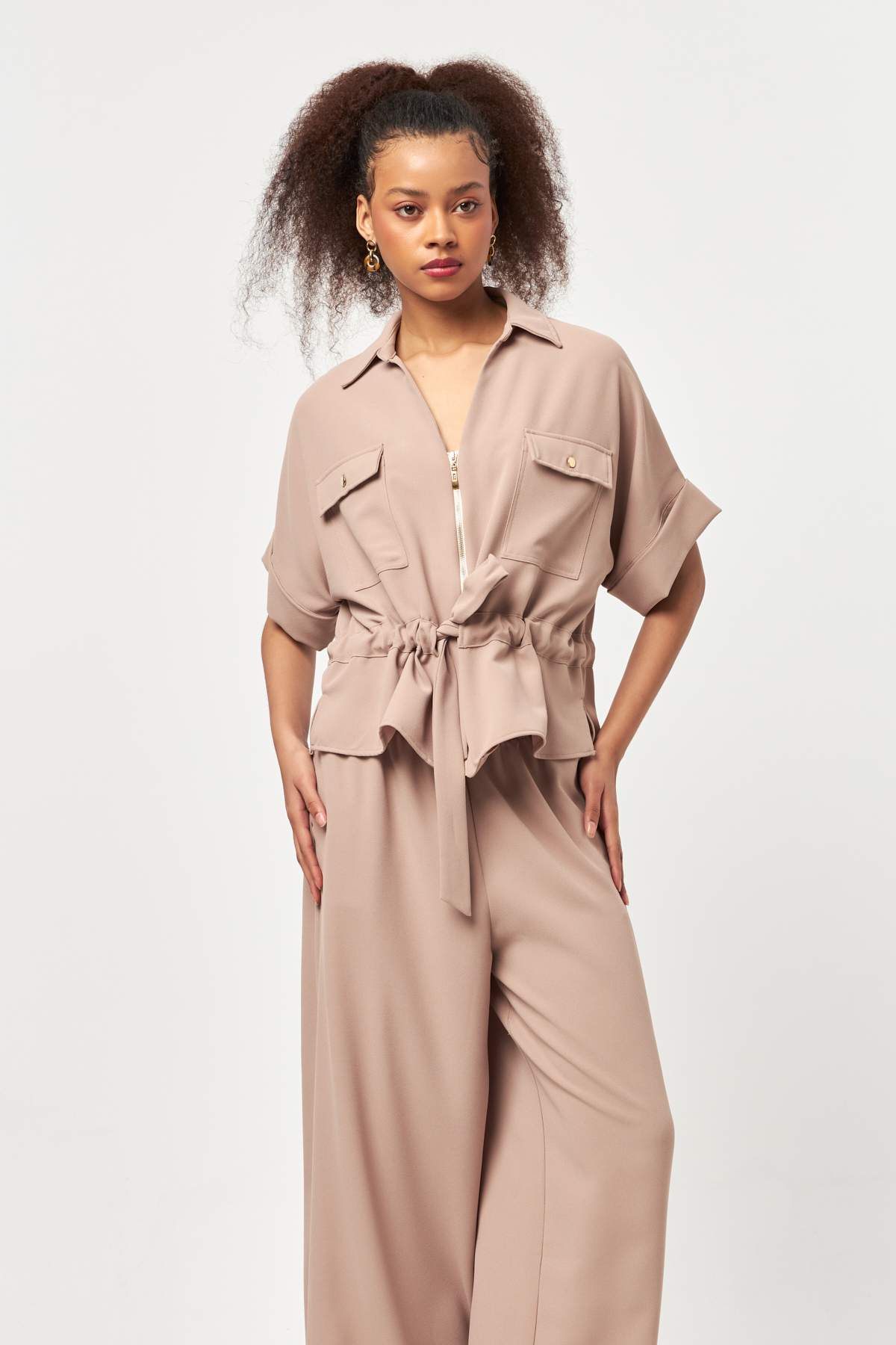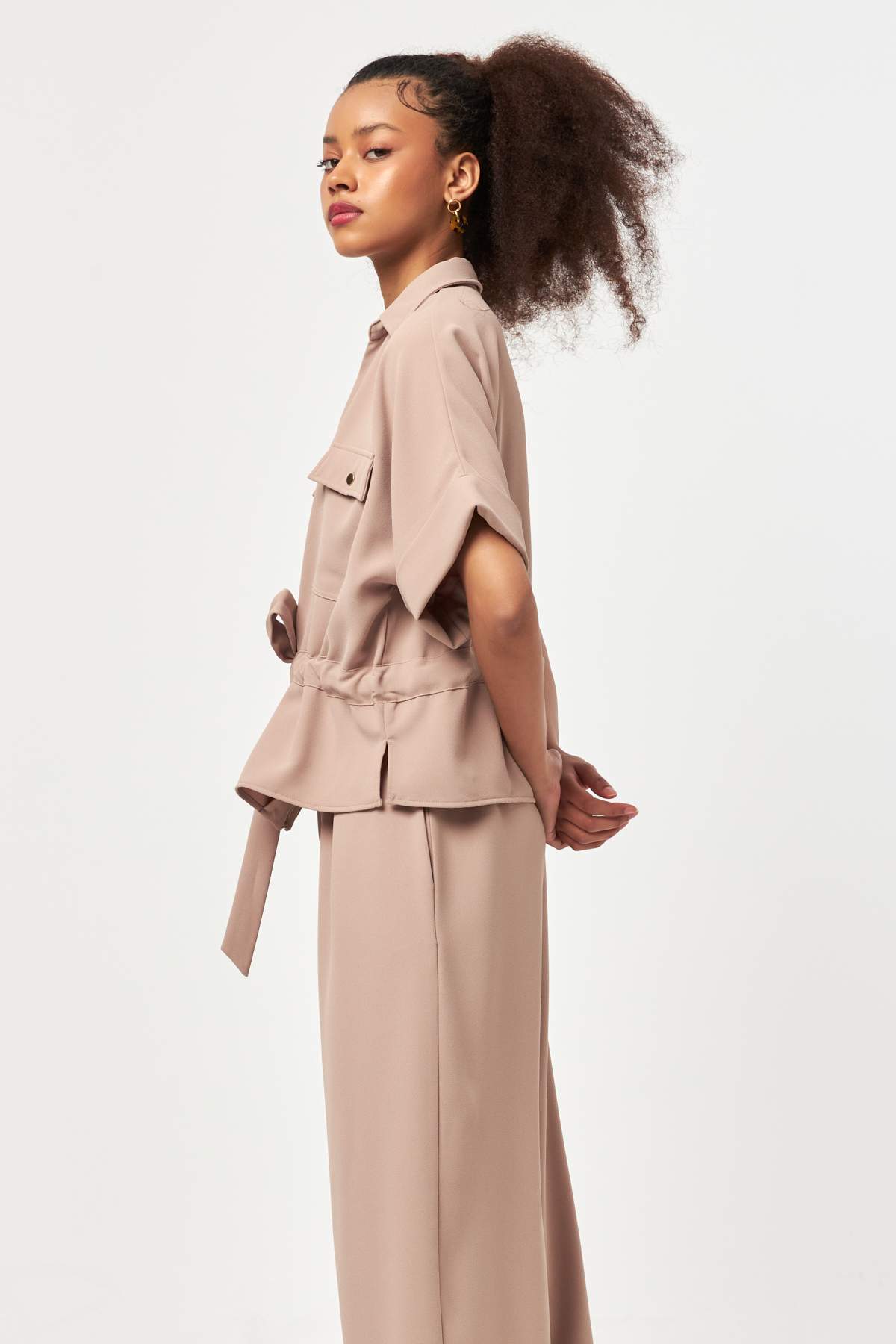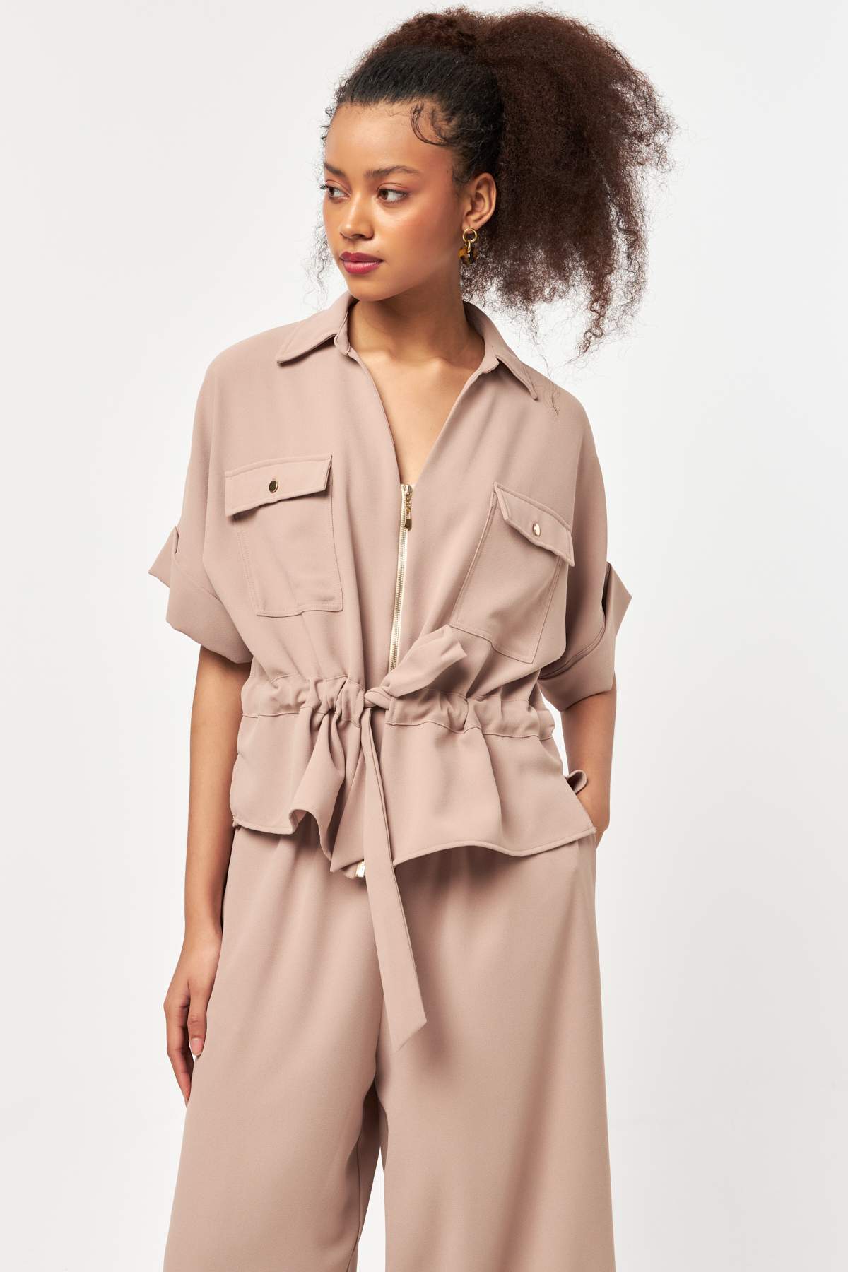 Designed with a refined balance of structure and softness, Beige Sculpt Waist Jacket highlights a modern silhouette through its adjustable waist detail.