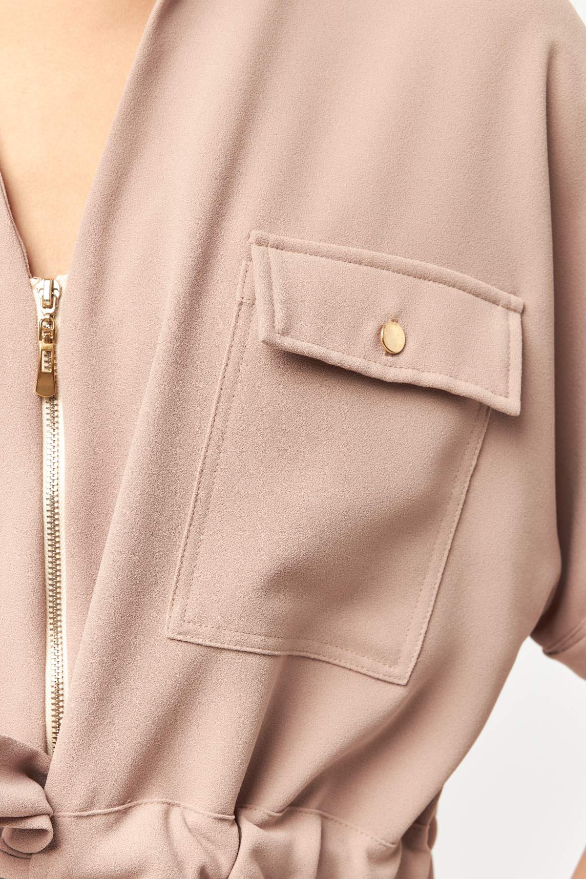Featuring a front zip closure, short sleeves, and functional chest pockets, this jacket offers a clean yet versatile look. The woven fabric provides a smooth feel while maintaining structure, making it ideal for everyday styling and transitional seasons.