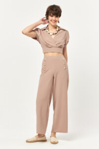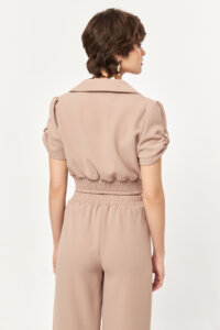 Featuring short puff sleeves with subtle shoulder gathering, the blouse adds volume and softness to the upper silhouette. The smooth woven fabric maintains structure while allowing gentle movement, making the piece ideal for both coordinated looks and elevated everyday styling.