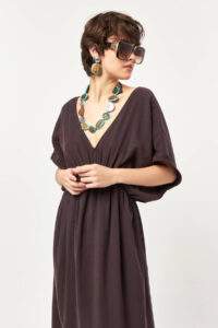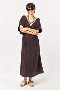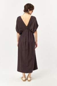 Crafted from a soft and breathable modal-blend fabric, this V-neck midi dress combines fluid movement with a refined silhouette. The softly gathered waist creates gentle shape definition while maintaining all-day comfort. Finished in the deep Bitter tone, this dress offers a more elevated and versatile look, making it suitable for both daytime styling and effortless evening transitions.