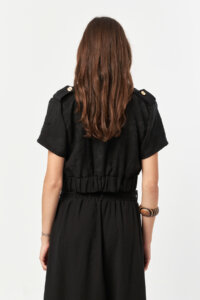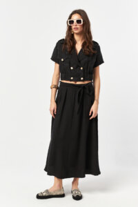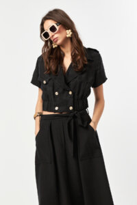 Cut in a cropped silhouette with a softly structured shape, the jacket features a double-breasted front with gold-tone buttons for a polished contrast. Short sleeves and a gently elasticated hem create balance between structure and comfort, allowing the jacket to sit naturally at the waist. Lightweight and breathable, it works seamlessly as a statement piece or as part of a coordinated set.