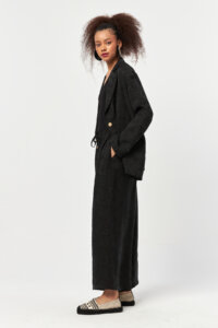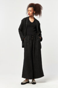 Designed in classic black jacquard fabric, Snuff Jacquard Drawstring Wide-Leg Pants – Black present a clean yet textured take on relaxed dressing. The tonal woven pattern adds subtle depth to the surface, giving the piece a refined, elevated feel beyond a standard black pant.