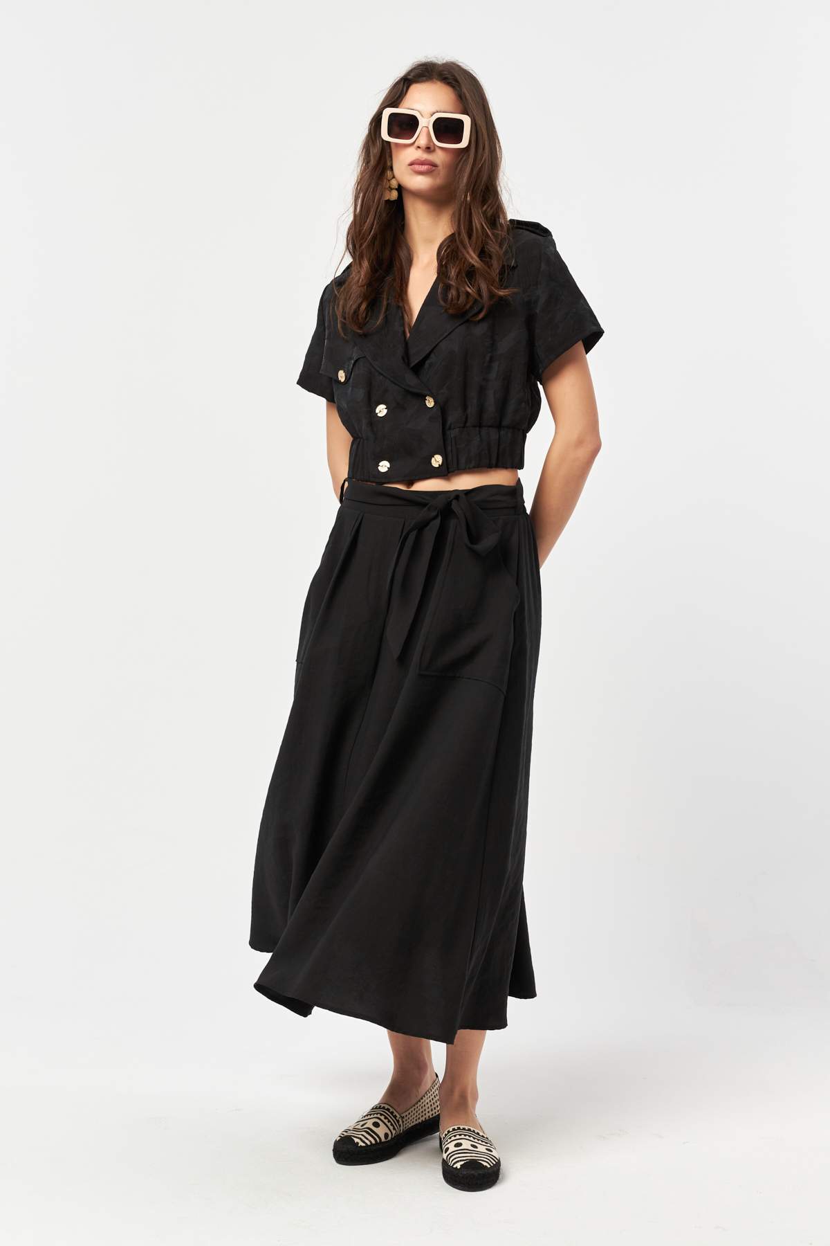 Featuring a self-fabric tie belt, the design allows for an adjustable and flattering fit at the waist, while front patch pockets add functional ease to the minimalist form. Lightweight and breathable, the skirt offers smooth movement and lasting comfort—perfect for elevated everyday styling or modern coordinated sets.
