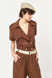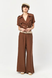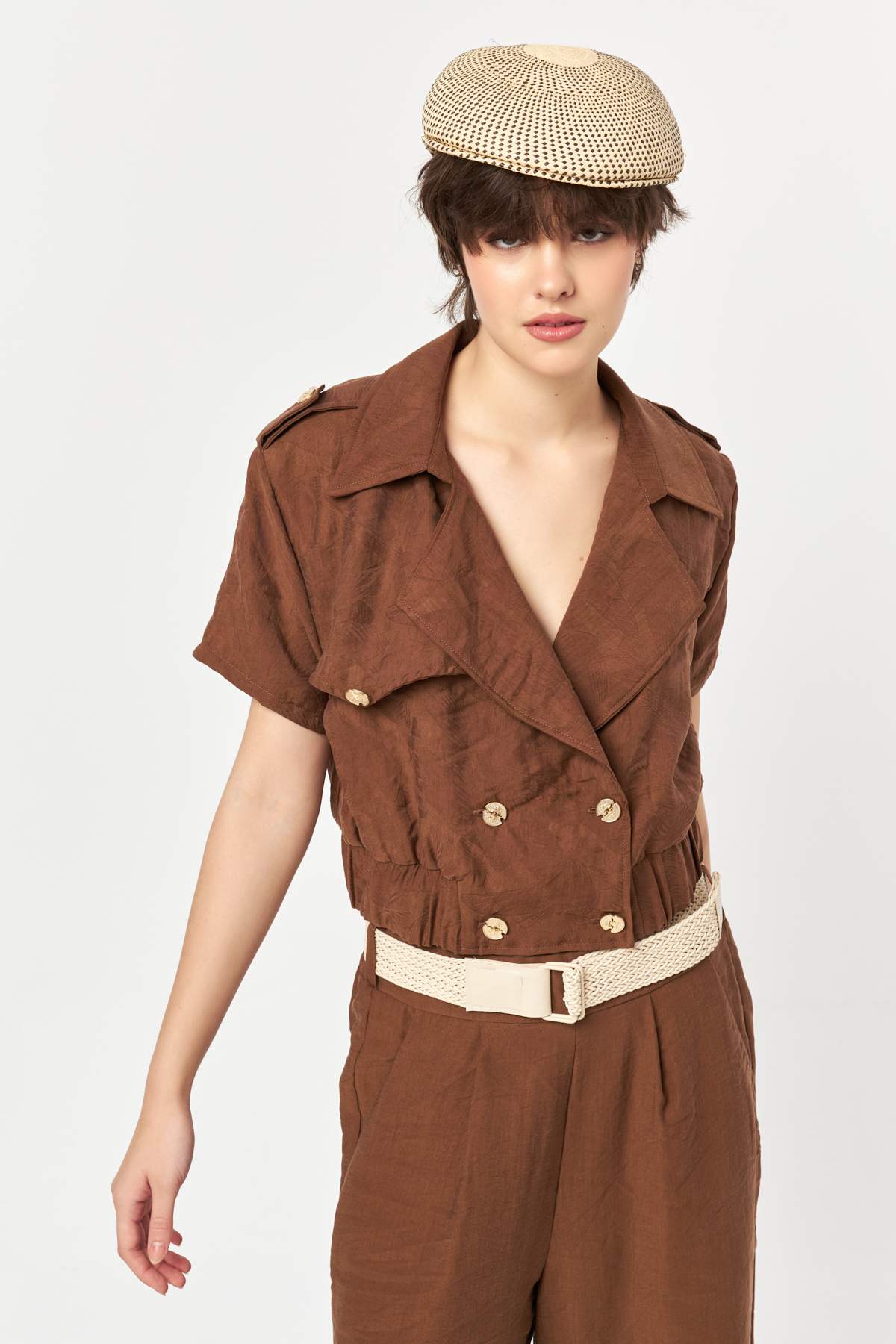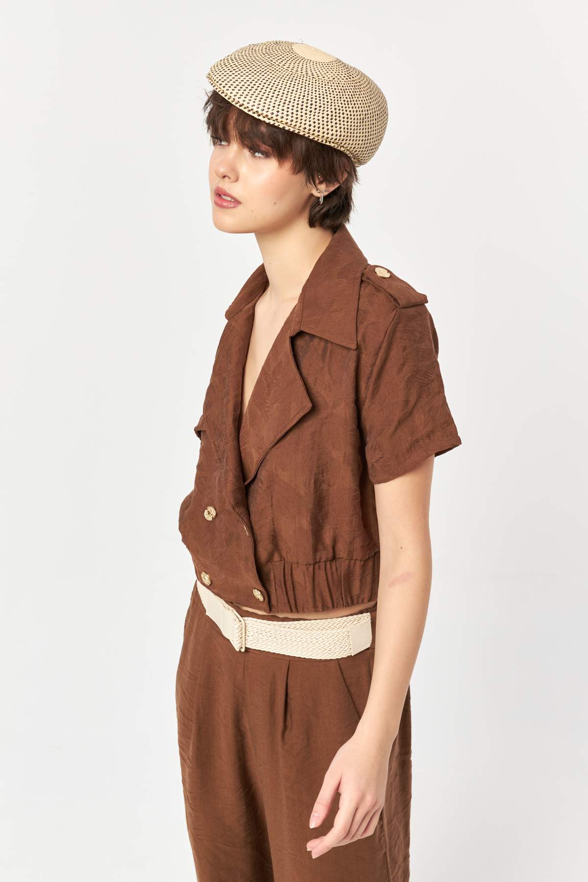 Cut in a cropped silhouette with a softly structured form, the jacket features a double-breasted front with tonal buttons for a clean, understated finish. Short sleeves and a gently elasticated hem create a balanced shape that sits comfortably at the waist. Lightweight and breathable, it’s ideal for warm-weather styling and refined coordinated sets.