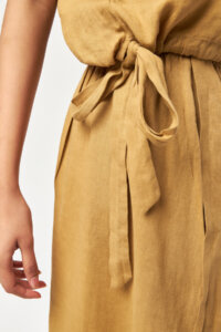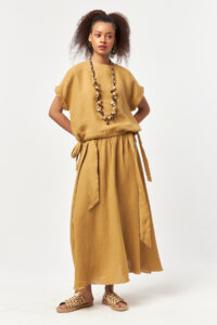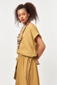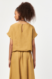 Rendered in a warm caramel tone, this linen blouse brings a sun-kissed richness to effortless summer styling. The lightweight linen fabric drapes softly on the body, while the adjustable side-tie detail allows for a relaxed, personalized fit. Its clean silhouette and fluid texture make it an easy yet refined choice for everyday wear and coordinated set looks.