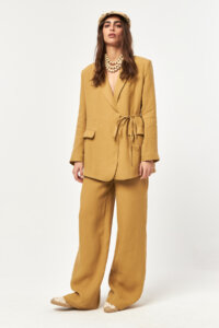 The tailored jacket features a wrap-style front with an adjustable tie detail, allowing for a customizable fit that flatters the waist. Functional flap pockets and clean tailoring details balance comfort with sophistication. Paired with matching wide-leg trousers, the elasticated waistband ensures ease of movement and all-day comfort.