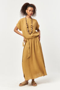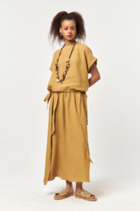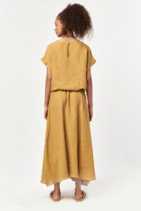 Rendered in a warm caramel tone, this linen skirt brings a soft, sun-warmed depth to relaxed summer styling. The lightweight, garment-washed linen flows effortlessly, while the adjustable waist tie offers comfort and flexibility. A subtle side slit enhances movement, creating an easy yet refined silhouette for everyday wear.