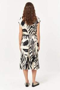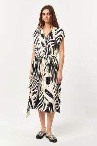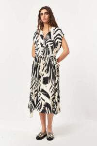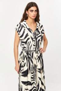 The Contour Graphic Shirt Dress blends a fluid silhouette with a bold all-over graphic print. Designed with a classic shirt collar and full button-front closure, this style is softly defined at the waist with a self-fabric tie belt. Lightweight and easy to wear, it offers a relaxed yet polished look suitable for everyday summer styling.