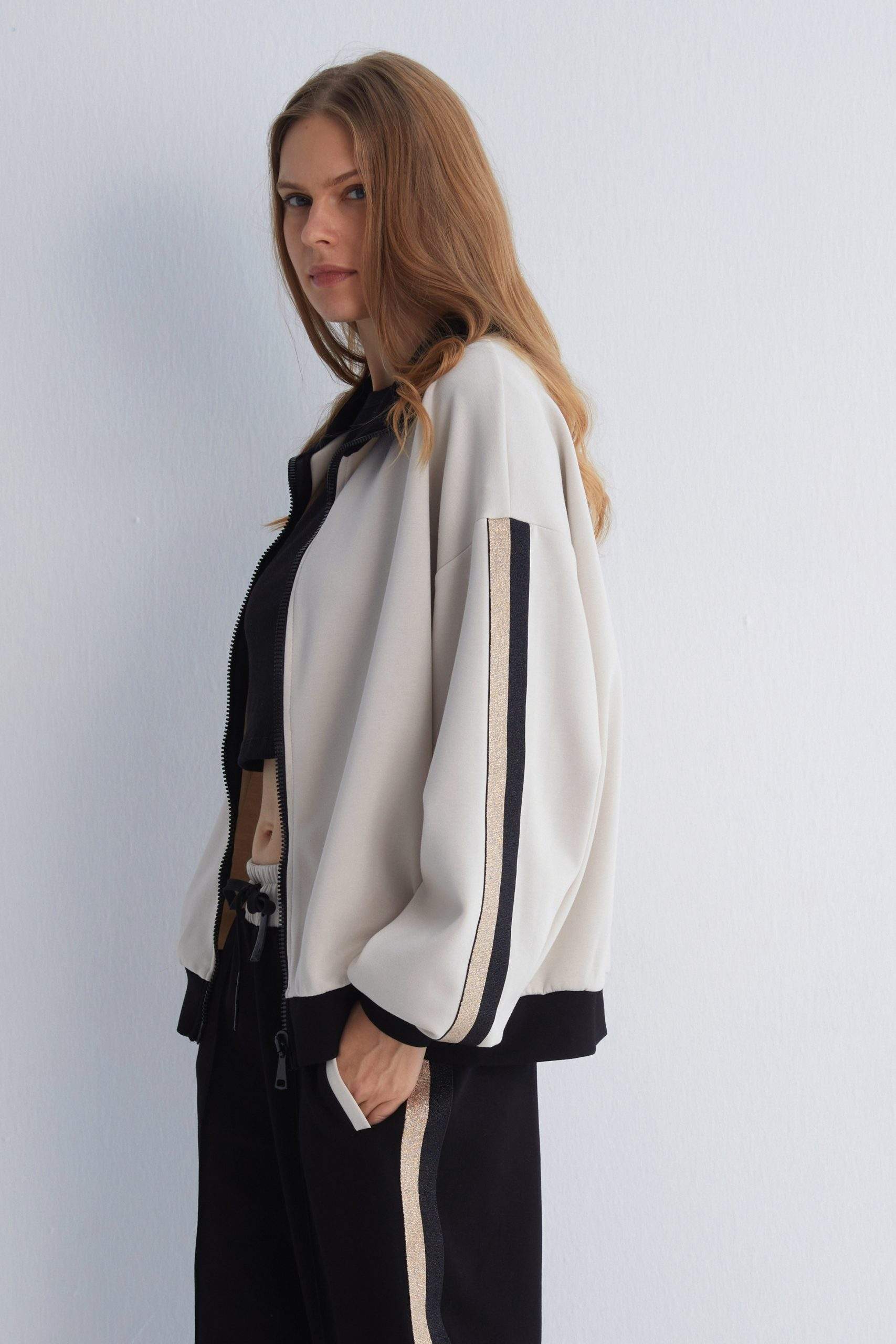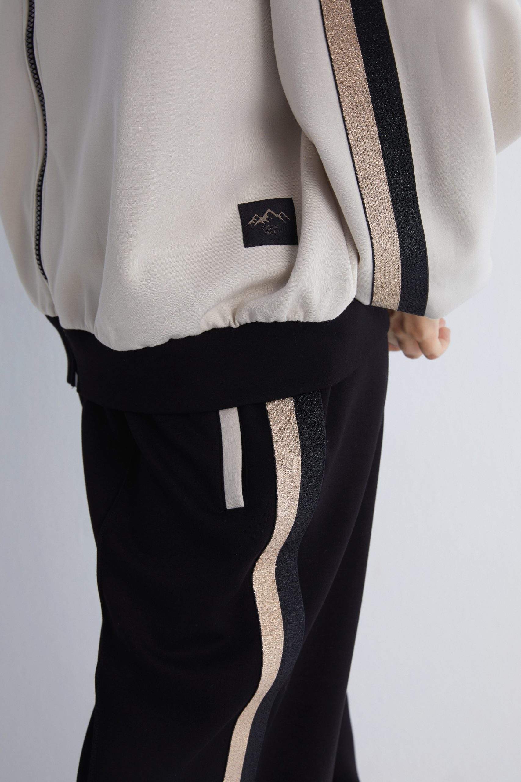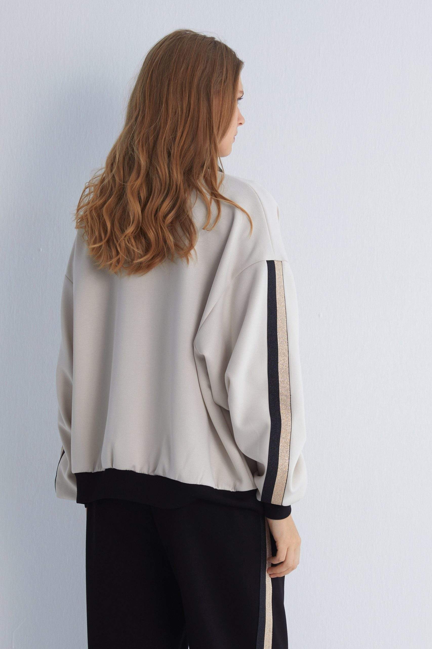 - Solid beige base with black and gold stripe detailing on the sleeves