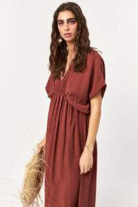 A softly draped V-neck midi dress in a warm Croquant tone, featuring a relaxed silhouette and fluid movement for natural, sun-kissed summer styling.
