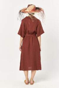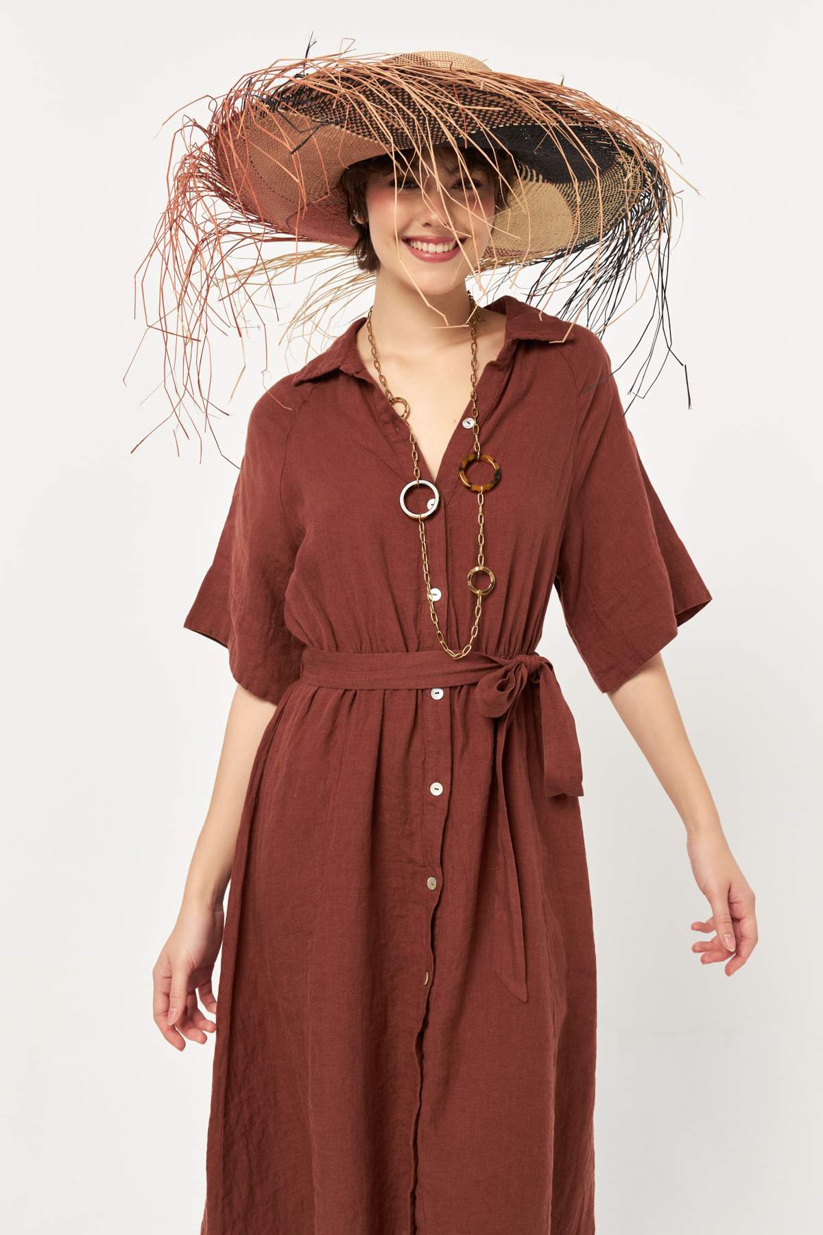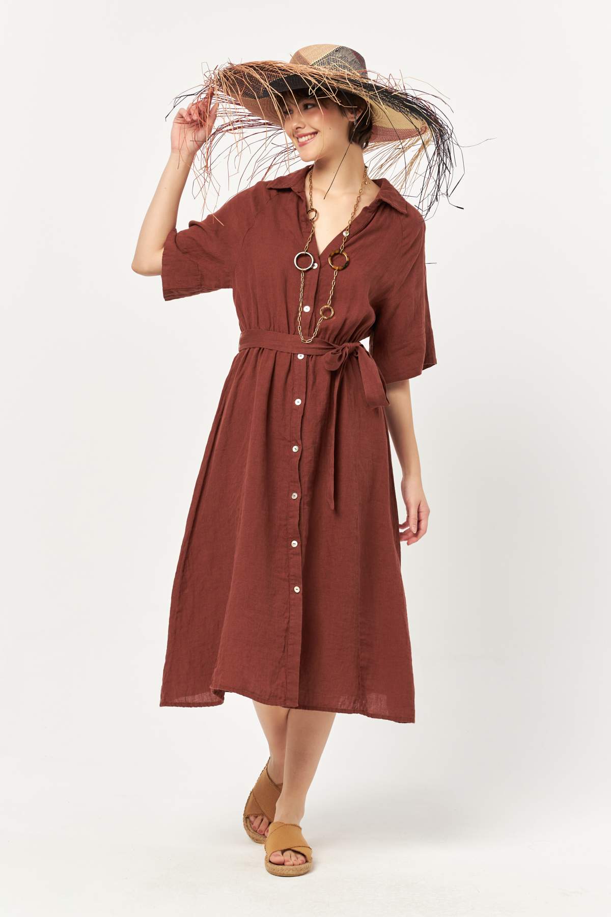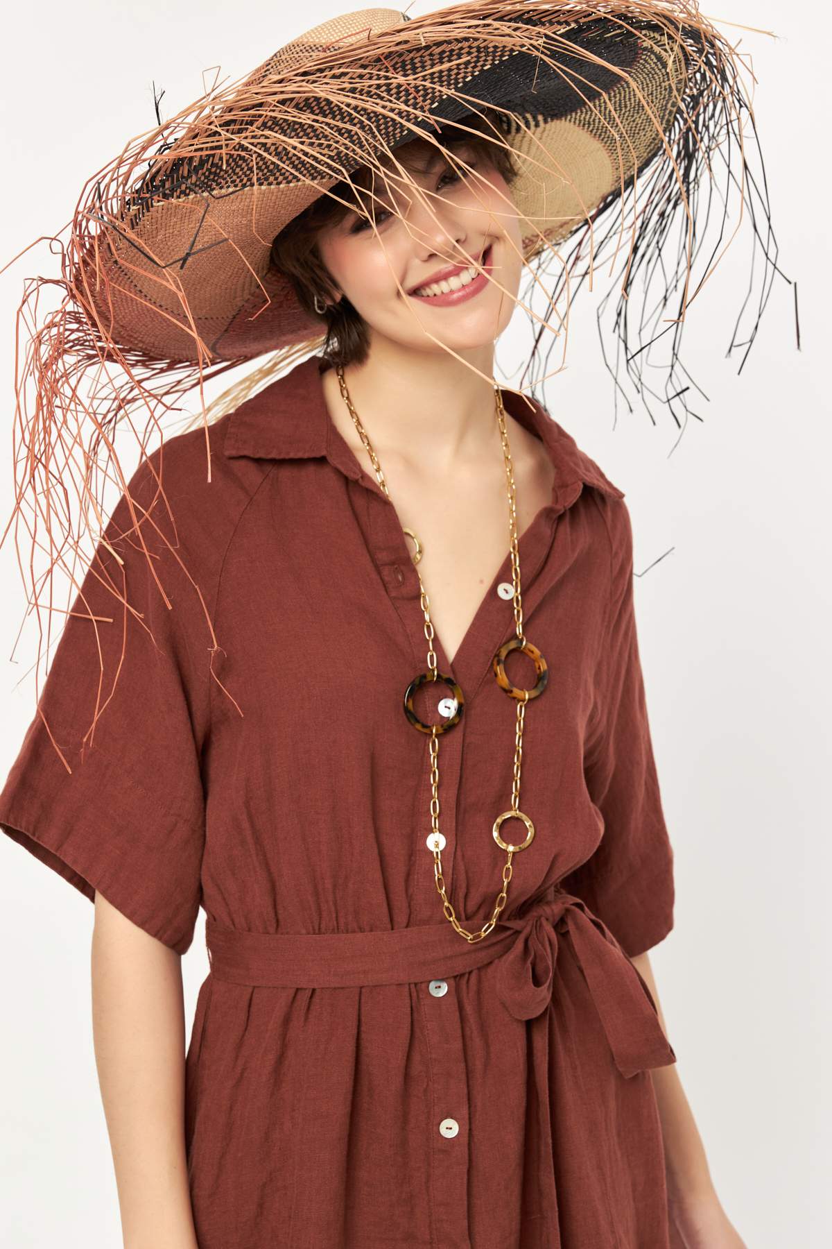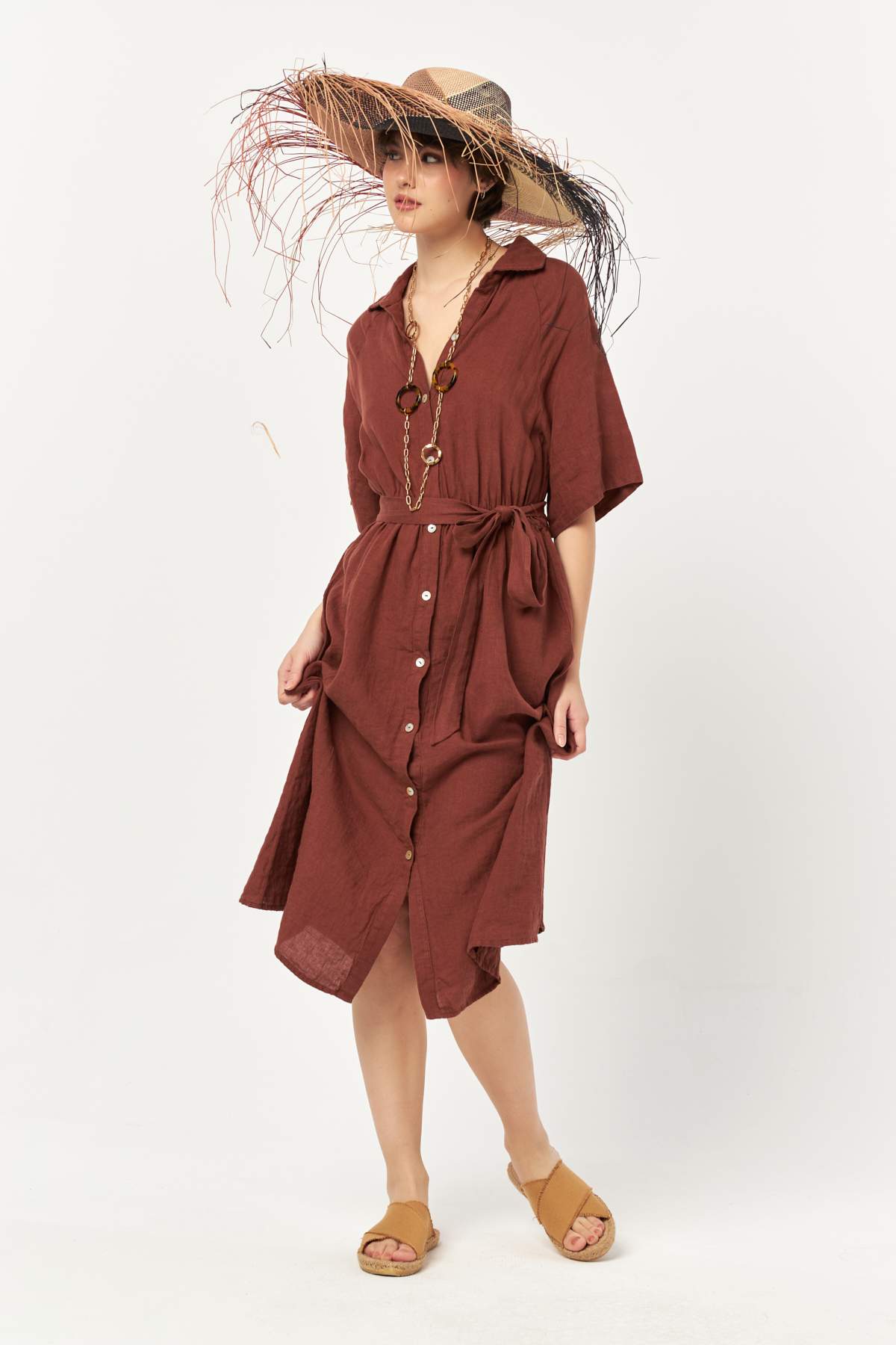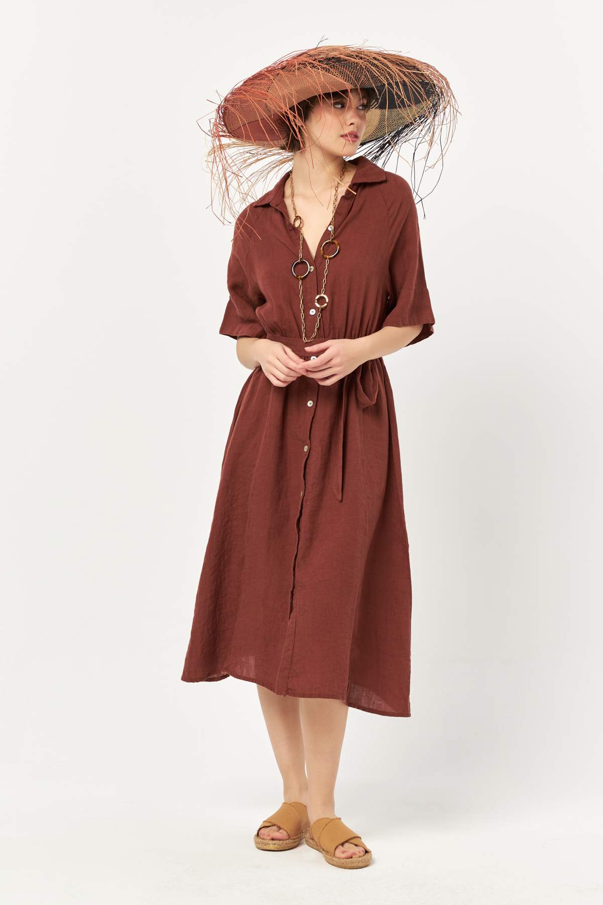 Presented in a warm croquant hue, this linen shirt dress brings a soft, sun-touched feel to everyday summer dressing. The breathable linen fabric and adjustable waist tie offer effortless comfort and a naturally relaxed silhouette—perfect for long days, travel moments, and easy city looks.