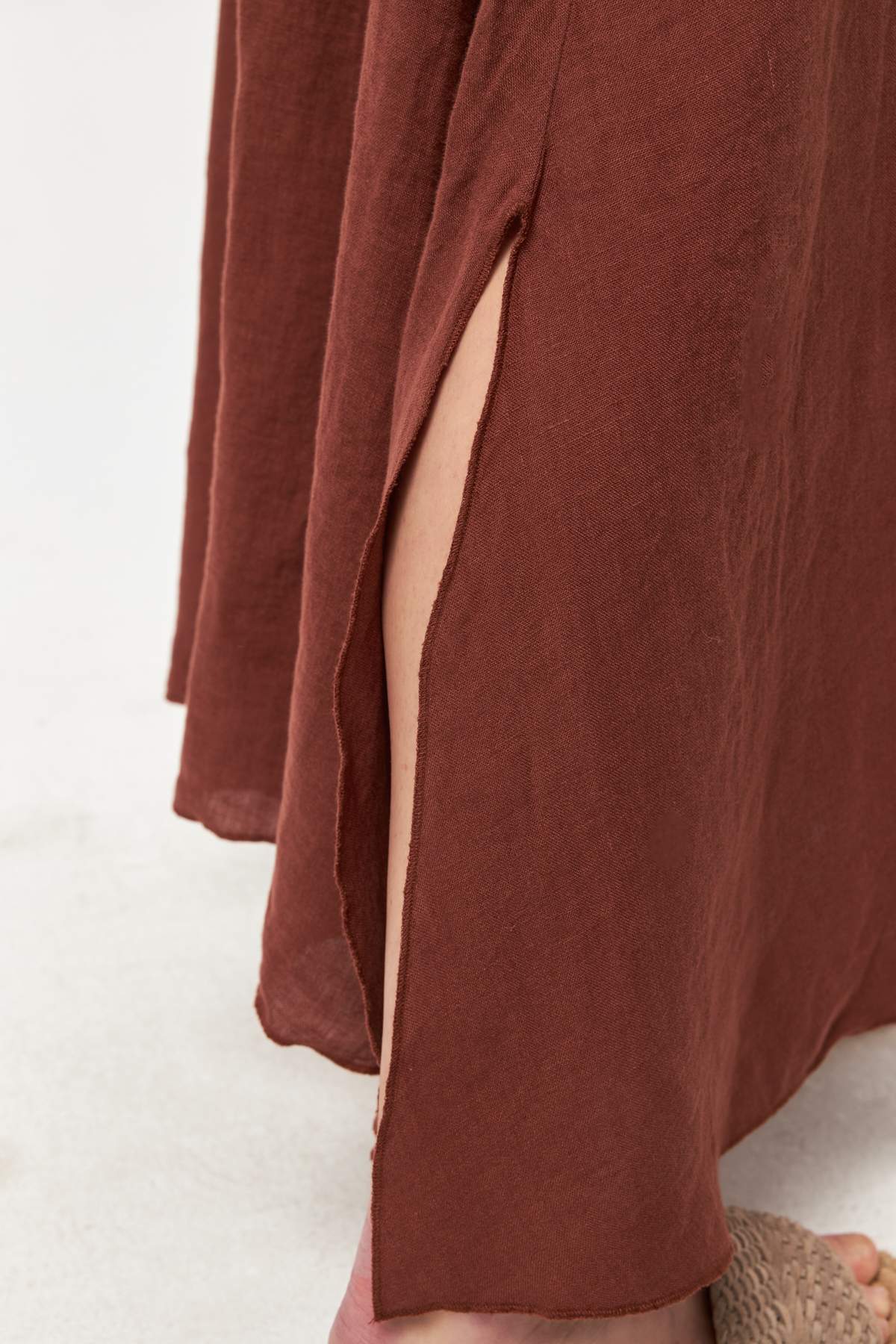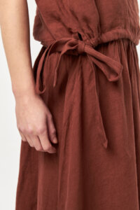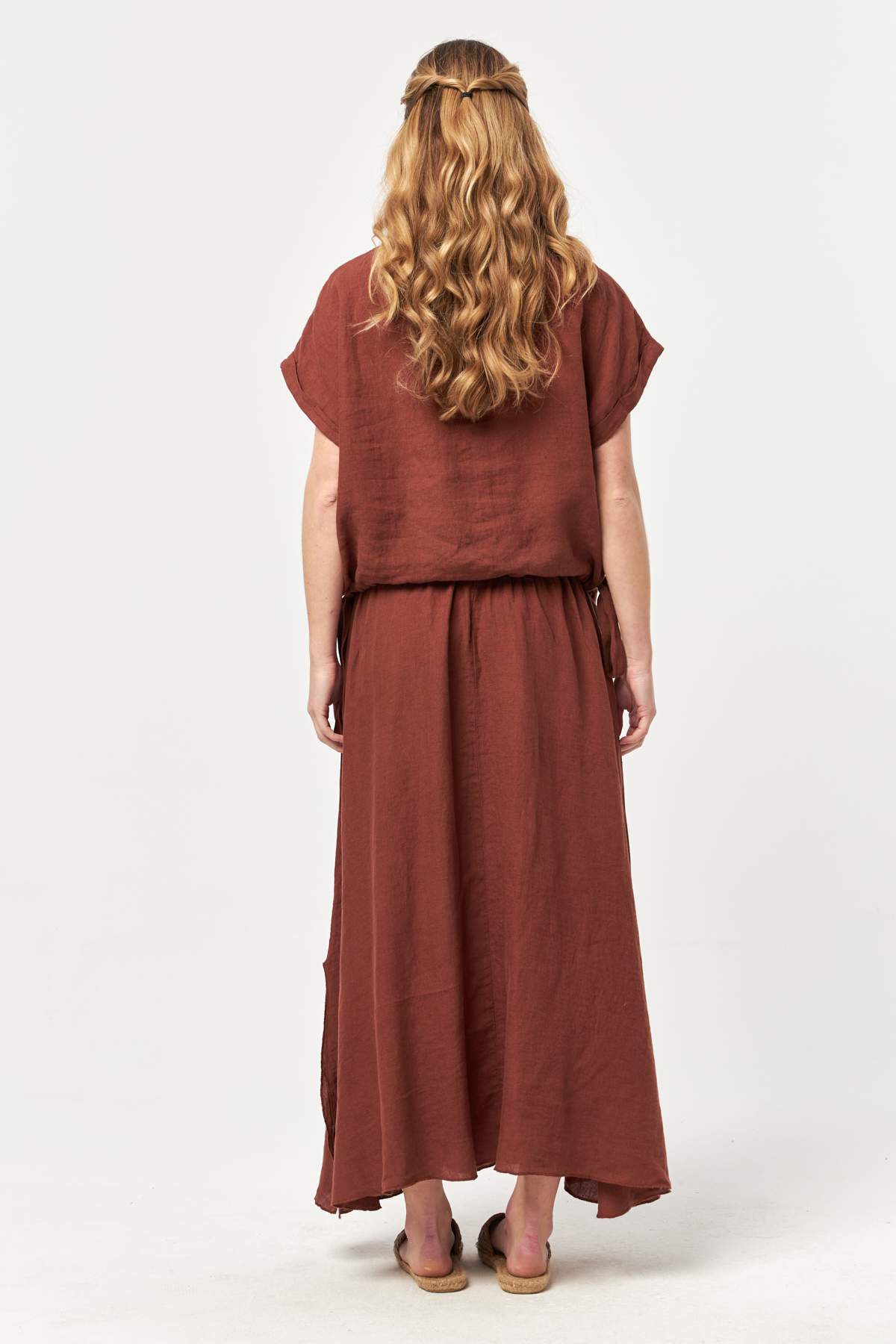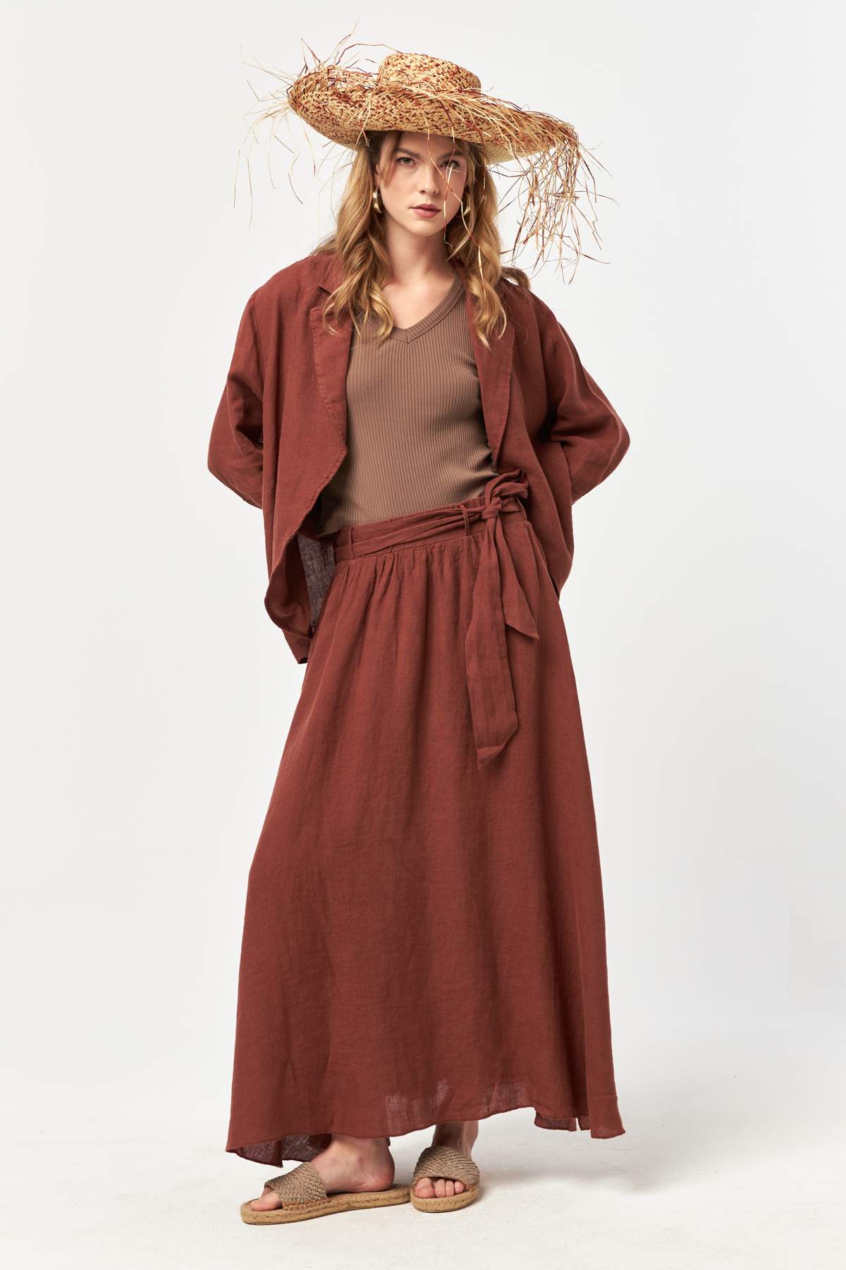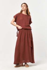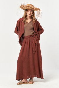 Designed in a warm croquant tone, this linen skirt brings natural elegance and effortless movement to summer wardrobes. The lightweight, garment-washed linen fabric flows softly with every step, while the adjustable waist tie offers a comfortable and flattering fit. A subtle side slit adds ease of movement and a refined, feminine touch.