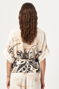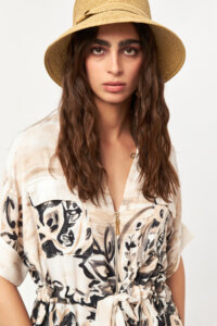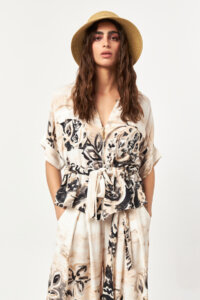 The Desert Bloom Belted Utility Shirt is designed with a relaxed silhouette and soft structure, highlighting effortless summer dressing. Featuring a classic shirt collar and an open V neckline, this style is shaped at the waist with a self-fabric tie belt. Functional chest pockets and side pockets add a utility-inspired touch, while the all-over artistic print brings depth and character to the look.
