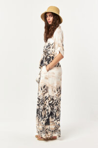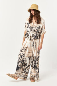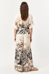 The Desert Bloom Belted Wide-Leg Pants combine fluid movement with a refined artisanal print. Designed with a high-rise waist and wide-leg silhouette, this style features functional side pockets and a self-fabric belt that softly defines the waist. The all-over print placement adds visual depth, while the lightweight woven fabric ensures breathable comfort for warm-weather wear.