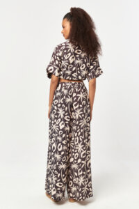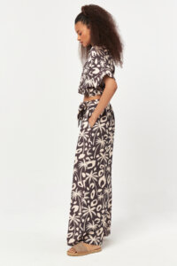 The Desert Nomad Belted Pants feature a fluid wide-leg silhouette accented with an all-over tropical-inspired graphic print. Designed with a high-rise waist and softly structured pleats, this style is finished with a self-fabric tie belt that allows for an adjustable and flattering fit. Lightweight and breathable, these pants offer effortless movement and relaxed elegance, perfect for warm-weather styling.