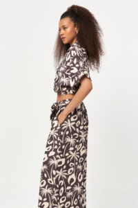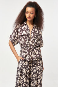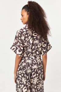 The Desert Palm Utility Shirt combines a relaxed silhouette with a bold palm-inspired graphic print. Designed with a classic shirt collar and a front zipper closure, this style is softly shaped at the waist with a self-fabric tie belt. Utility-inspired chest pockets add a functional touch, while the lightweight modal blend fabric ensures fluid movement and all-day comfort. An effortless statement piece for warm-weather styling.