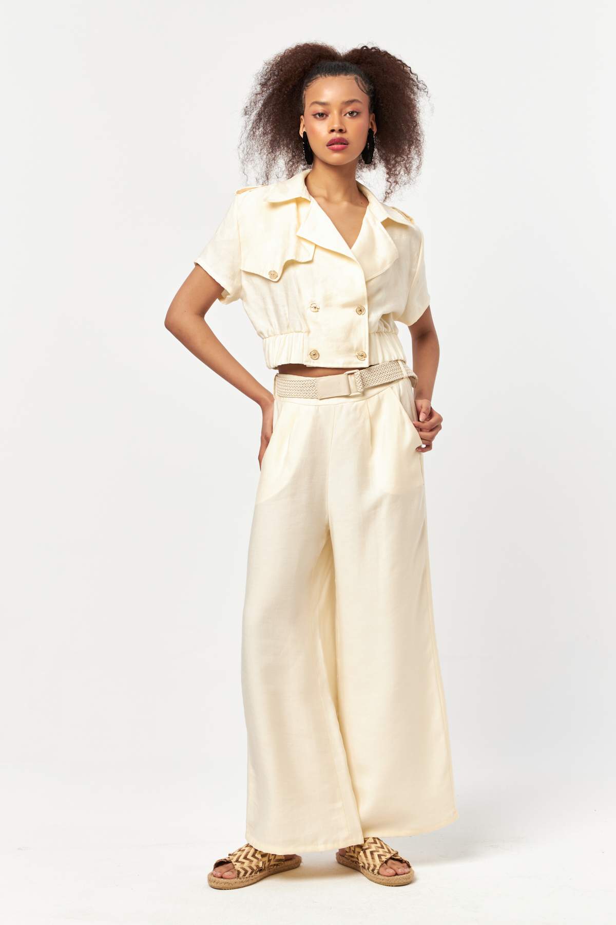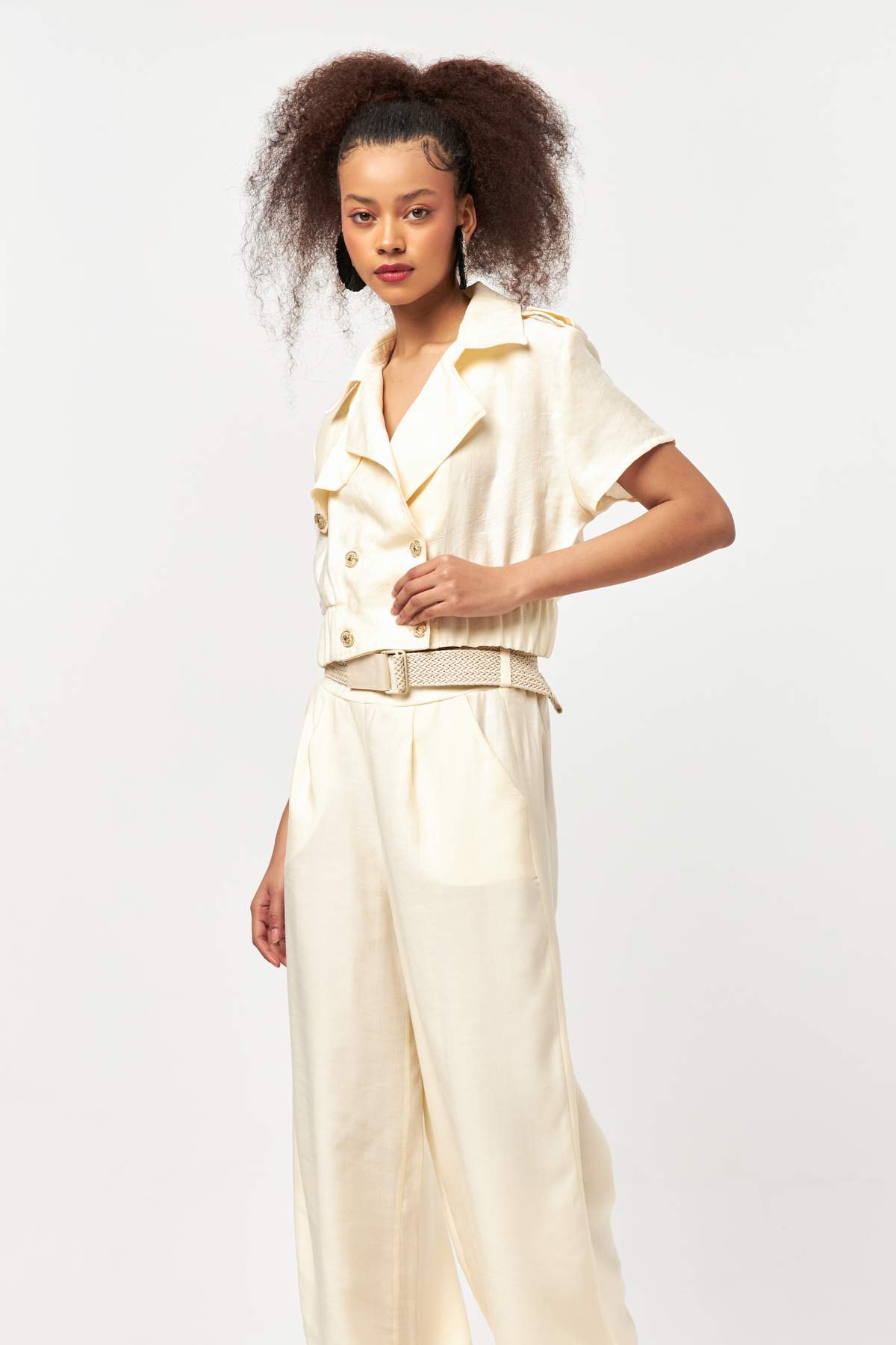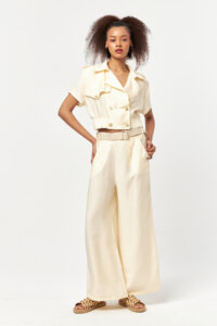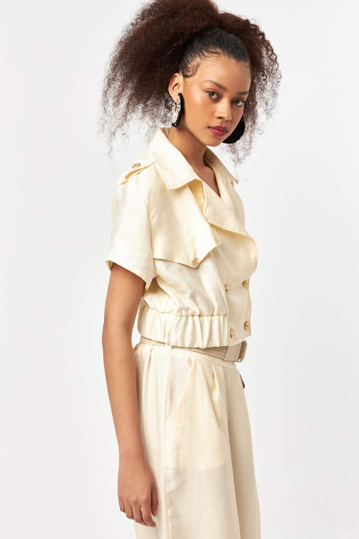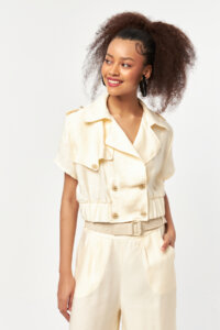Cut in a cropped silhouette with a softly structured shape, the jacket features a double-breasted front with tonal buttons for a clean, understated finish. Short sleeves and a gently elasticated hem create a balanced form that sits comfortably at the waist. Lightweight and breathable, it’s ideal for warm-weather styling, coordinated sets, and elevated everyday looks.