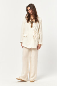 Paired with wide-leg trousers designed to move fluidly with the body, the set delivers breathable comfort and effortless sophistication.