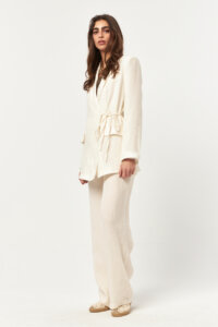 The light, neutral tone highlights the fabric’s organic texture, offering a fresh and timeless interpretation of summer tailoring.