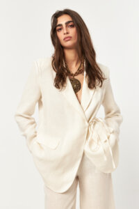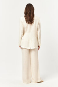 Presented in a soft Ecru shade, this linen tailored suit reflects a sense of quiet elegance and natural ease.
