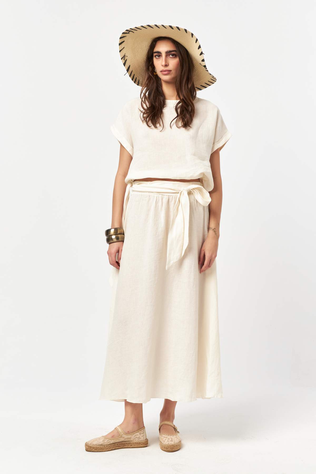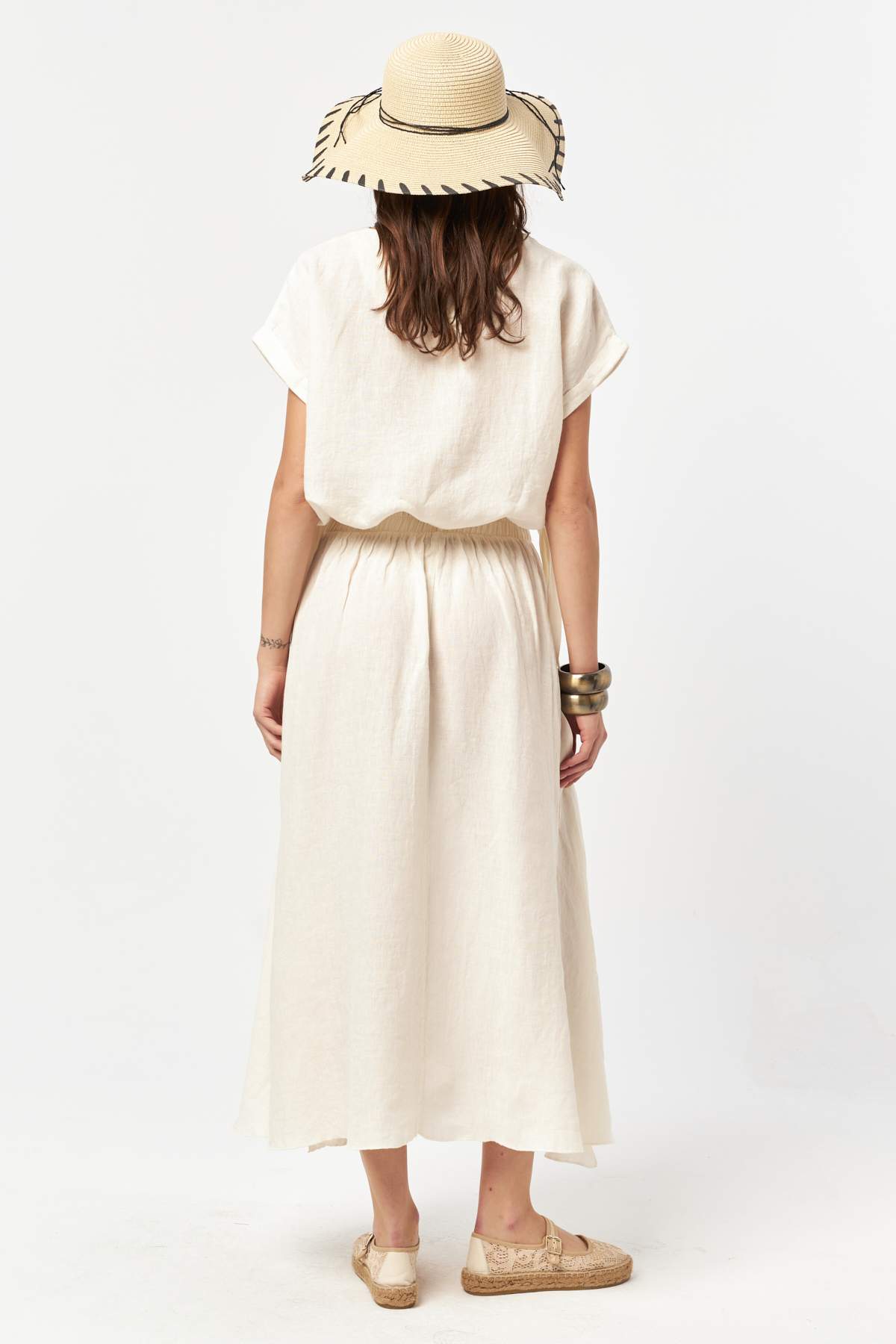 Finished in a soft ecru tone, this linen skirt delivers a clean and timeless summer look. The lightweight, breathable linen fabric flows naturally with movement, while the adjustable waist tie ensures relaxed comfort. A subtle side slit adds ease and fluidity, making it an effortless piece for everyday wear and warm-weather styling.