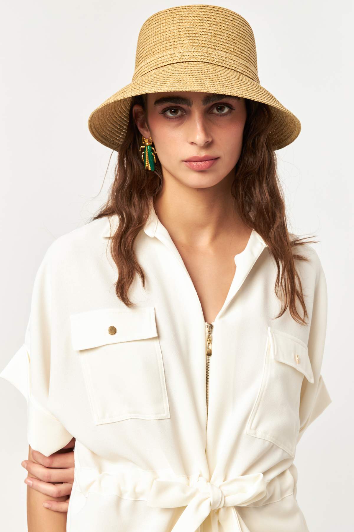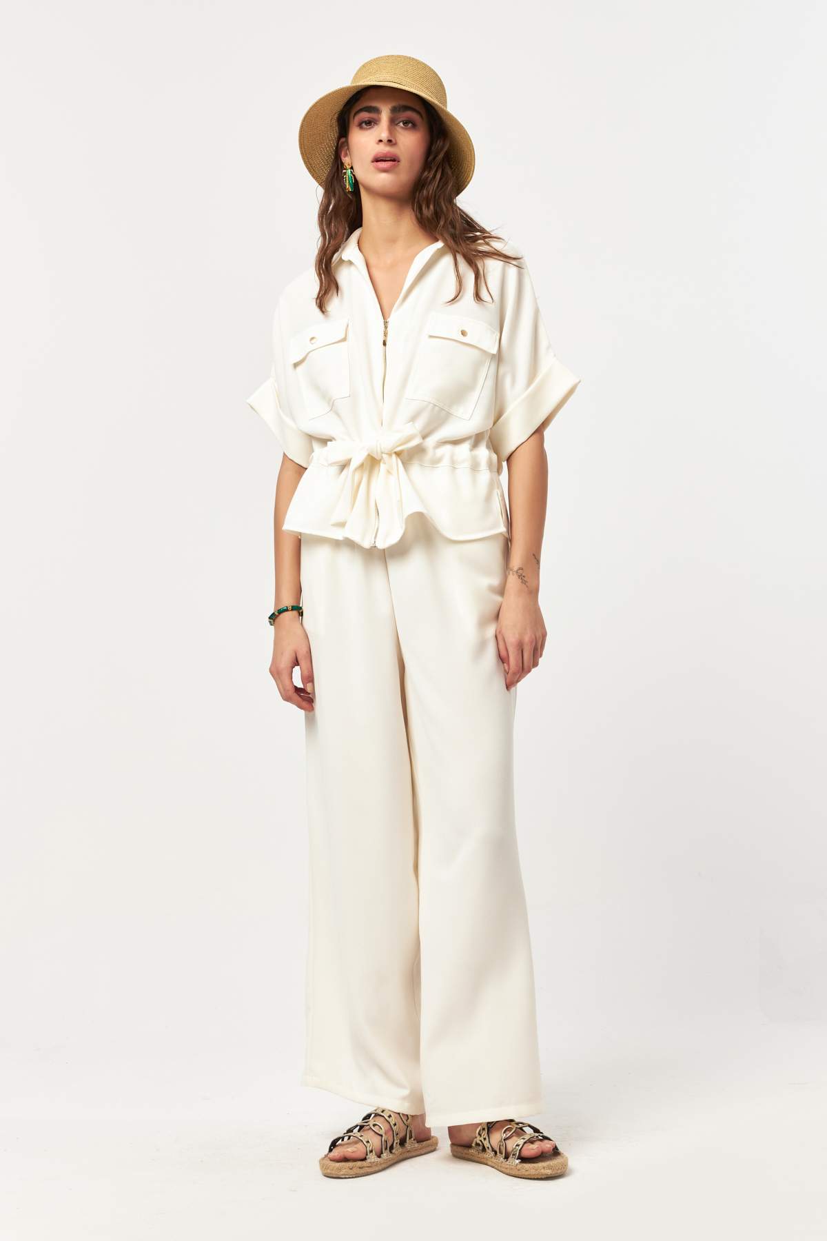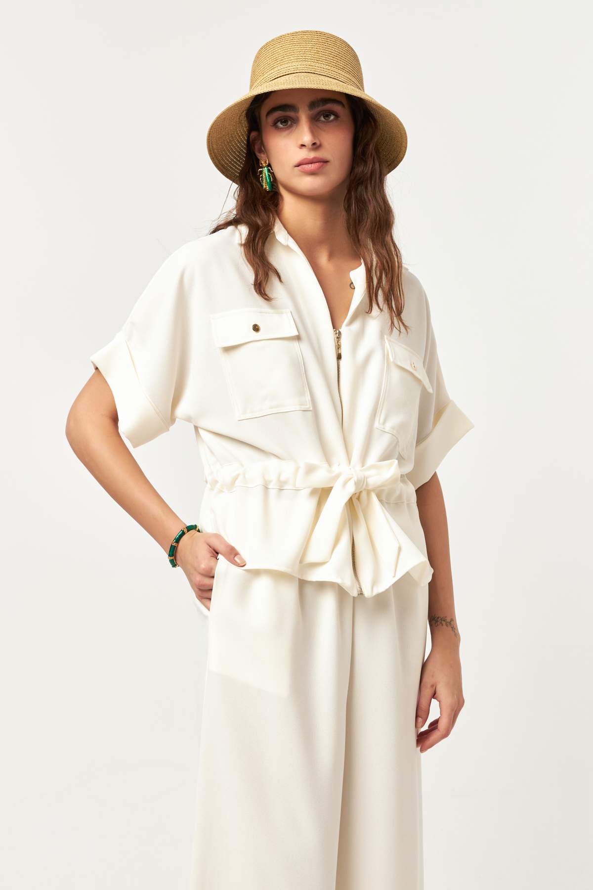 Featuring a front zip closure, short sleeves, and functional chest pockets, this jacket offers a balance of comfort and polish. The ecru tone brings a light, timeless feel—perfect for minimal styling and versatile day-to-day wear.