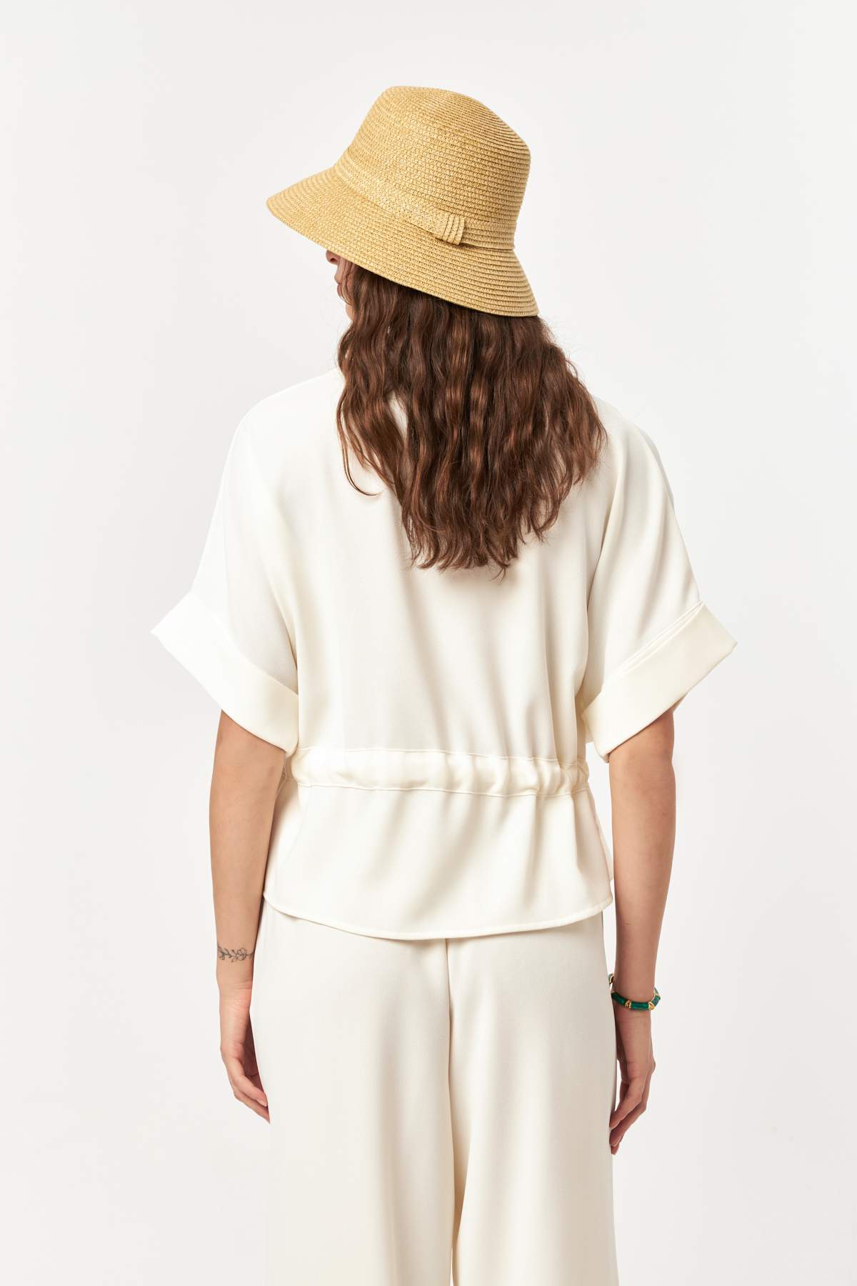 The drawstring waist gently defines the form, creating a soft yet structured look with effortless elegance.