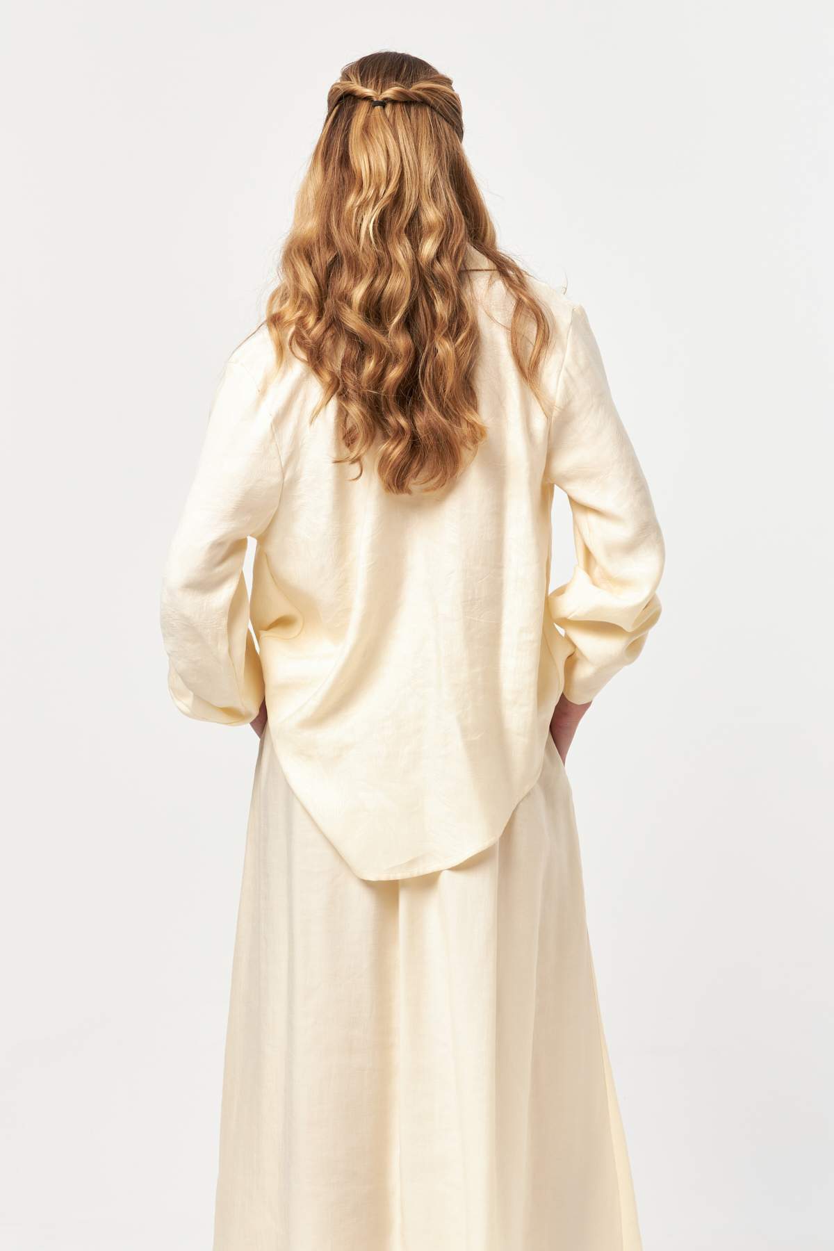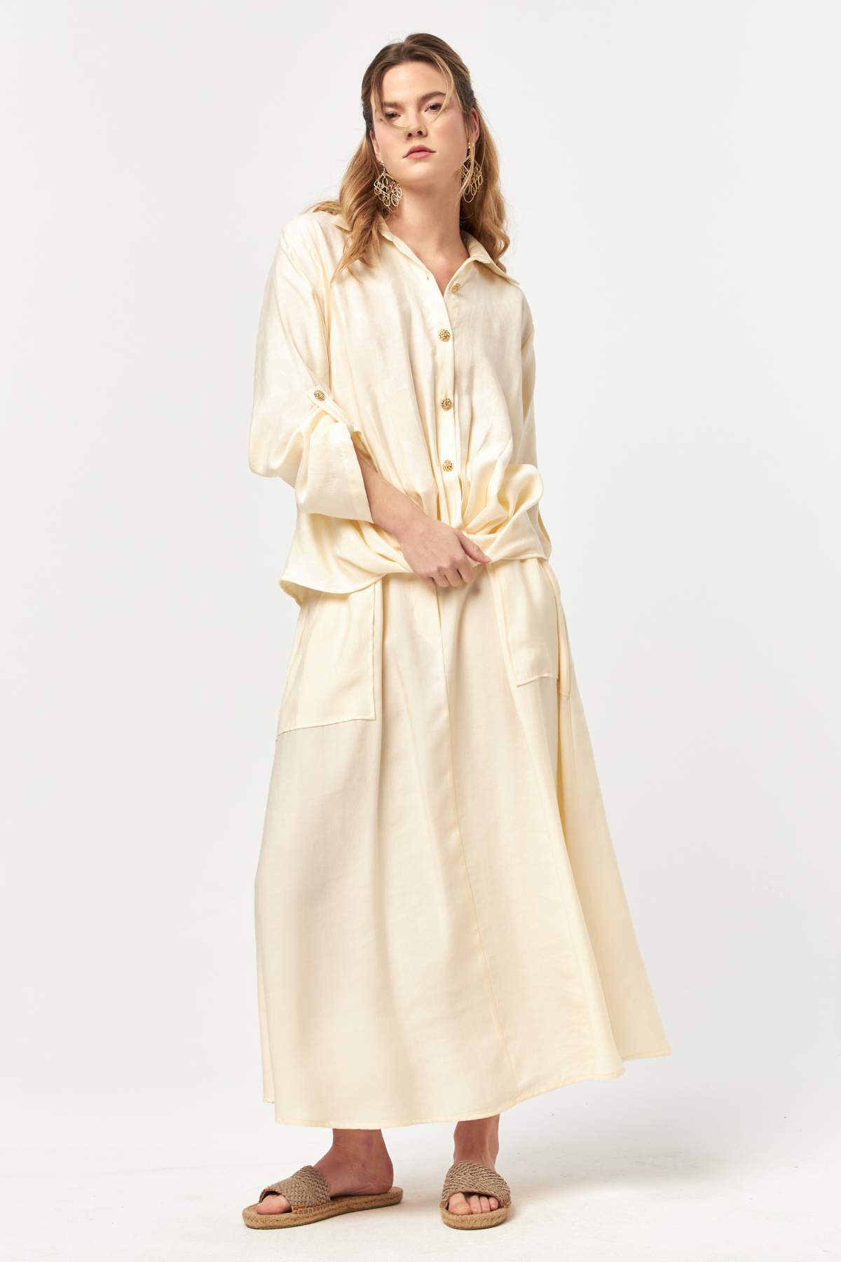 Designed with a fluid silhouette and refined detailing, Ecru Tie-Waist Flow Skirt offers effortless elegance with a functional edge. The soft woven fabric drapes naturally, creating movement and lightness throughout the length of the skirt.