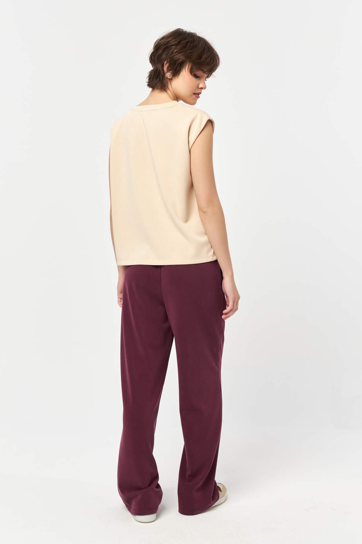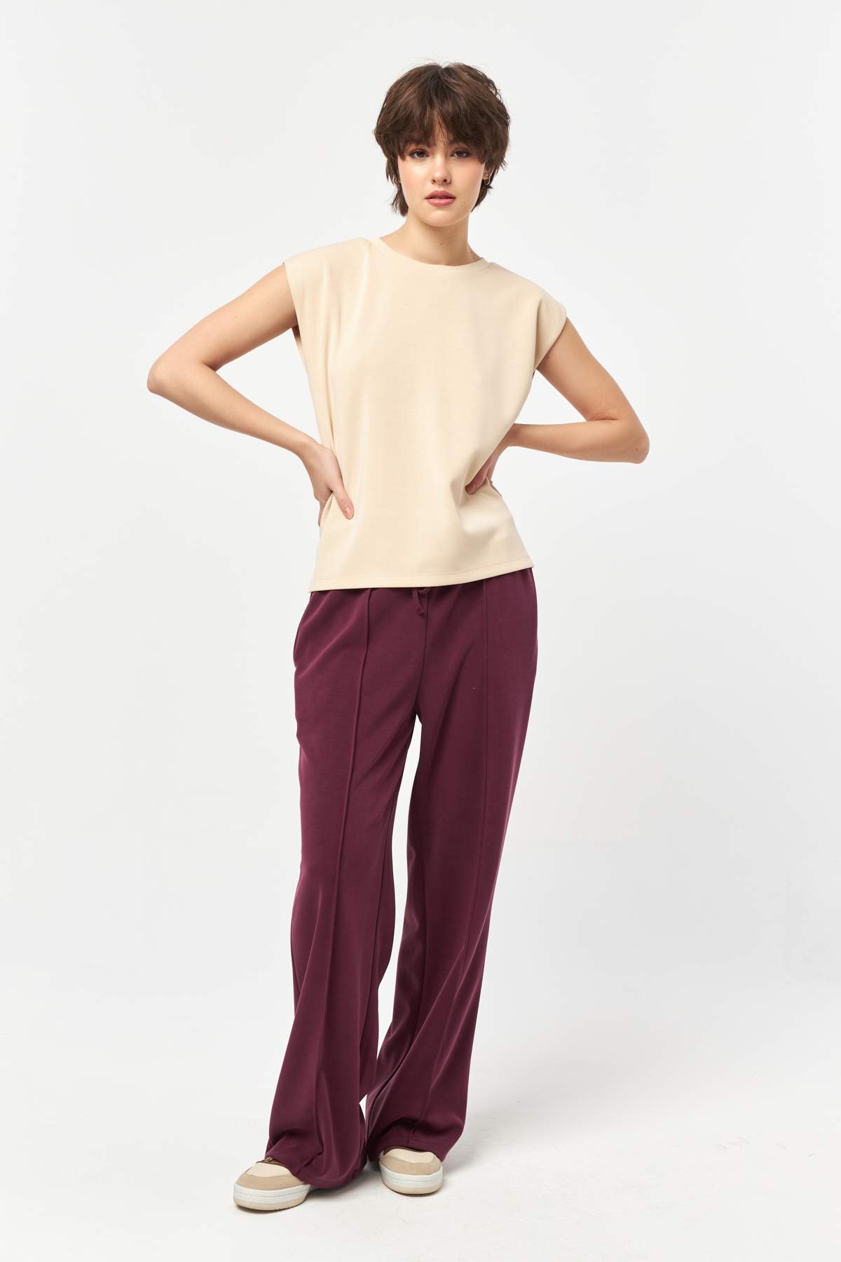 The rich burgundy tone adds depth and a modern edge, making it easy to style with neutral tops or matching pieces for a refined yet relaxed look.