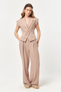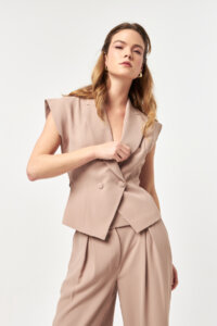 The Beige colourway reflects a soft, modern neutral with a warm undertone, bringing understated elegance to the tailored silhouette. Its clean and balanced tone enhances the sharp lines of the vest while maintaining a light, fluid appearance.