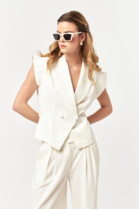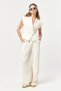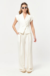 Designed with a modern sleeveless silhouette, the Fluid Sleeveless Tailored Cream Suit offers a refined balance between sharp tailoring and soft movement. The structured vest-style top features a double-breasted front, subtle shoulder shaping, and a clean V-neckline that elevates the overall look with a confident, contemporary edge.