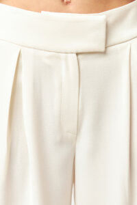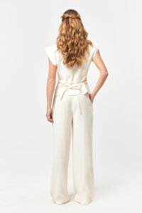 Paired with wide-leg trousers, the fluid drape of the fabric creates effortless motion while maintaining a polished appearance. Thoughtful details such as front pleats, side pockets, and a softly defined waist enhance both comfort and elegance. The cream colourway highlights the minimalist design, making this suit a versatile statement for warm-weather occasions, day-to-evening transitions, and elevated city styling.