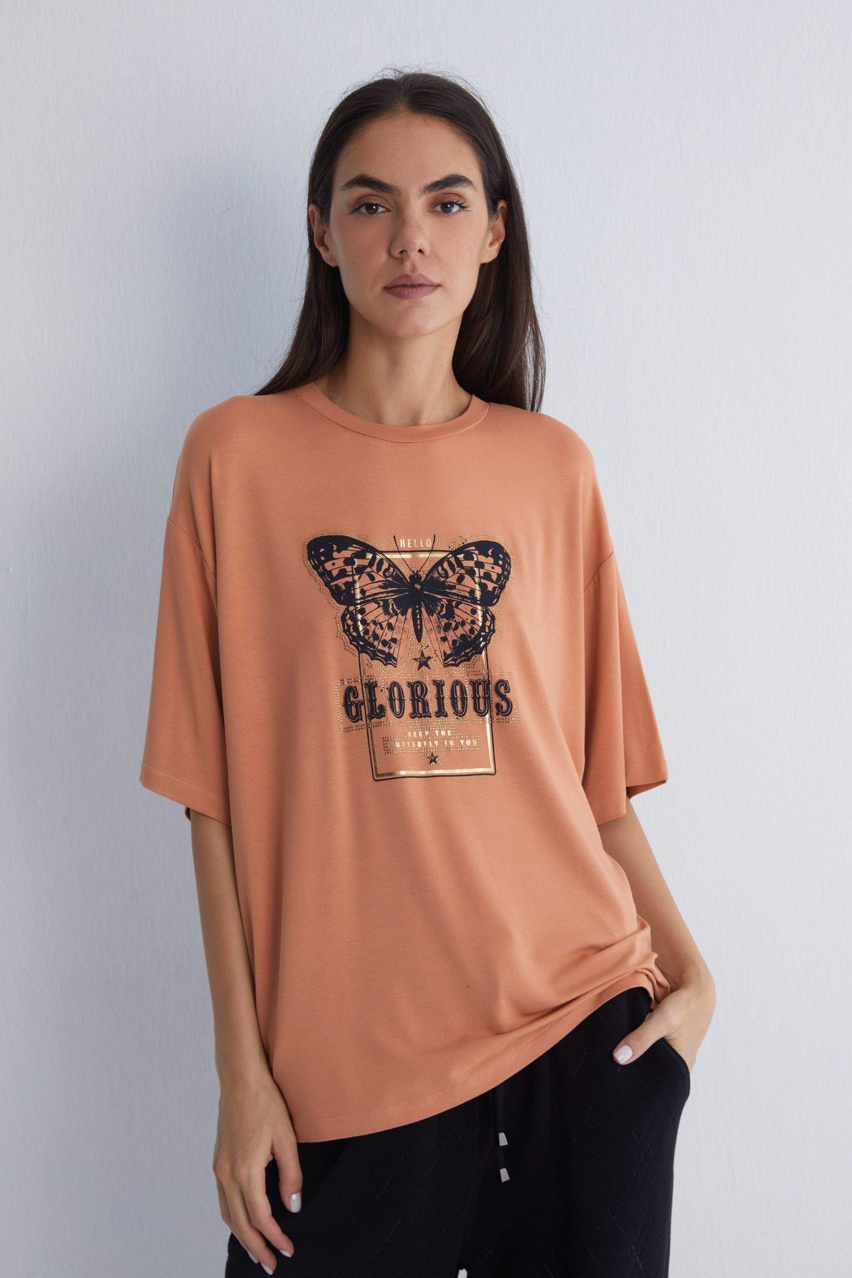 - Unique butterfly design with foil and stone print on the front.