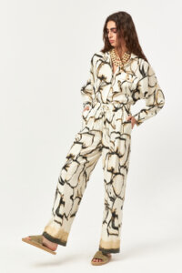 The dynamic abstract pattern flows naturally across the silhouette, while the lightweight fabric enhances movement and comfort throughout the day.