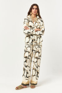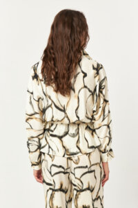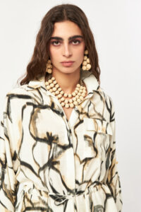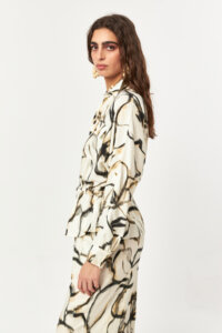 Featuring an adjustable waist tie, the silhouette can be shaped for a more defined fit or worn relaxed for an effortless look. A classic shirt collar, long sleeves with cuffs, and a single chest pocket balance the expressive print with clean, functional details.