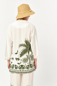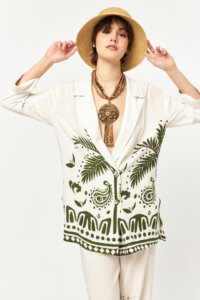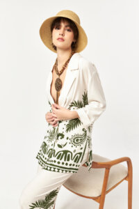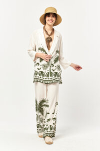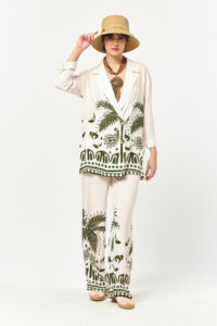 Designed with an all-over green palm print, this suit brings a fresh, vacation-inspired spirit to relaxed tailoring. The flowing silhouette combines comfort with statement design, offering an effortless yet refined look for warm-weather dressing.