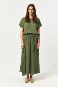Rendered in a natural khaki tone, this linen blouse brings an earthy and effortless feel to summer styling. The lightweight, breathable linen drapes softly on the body, while the adjustable side-tie detail allows for a relaxed yet personalized fit. Clean lines and a minimal silhouette make it an easy piece for everyday wear and coordinated set looks.