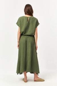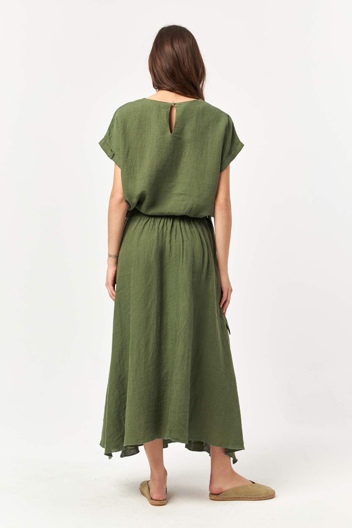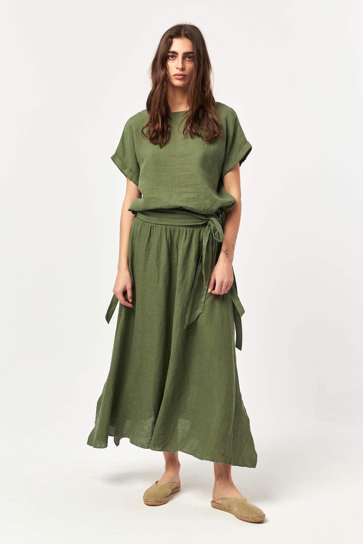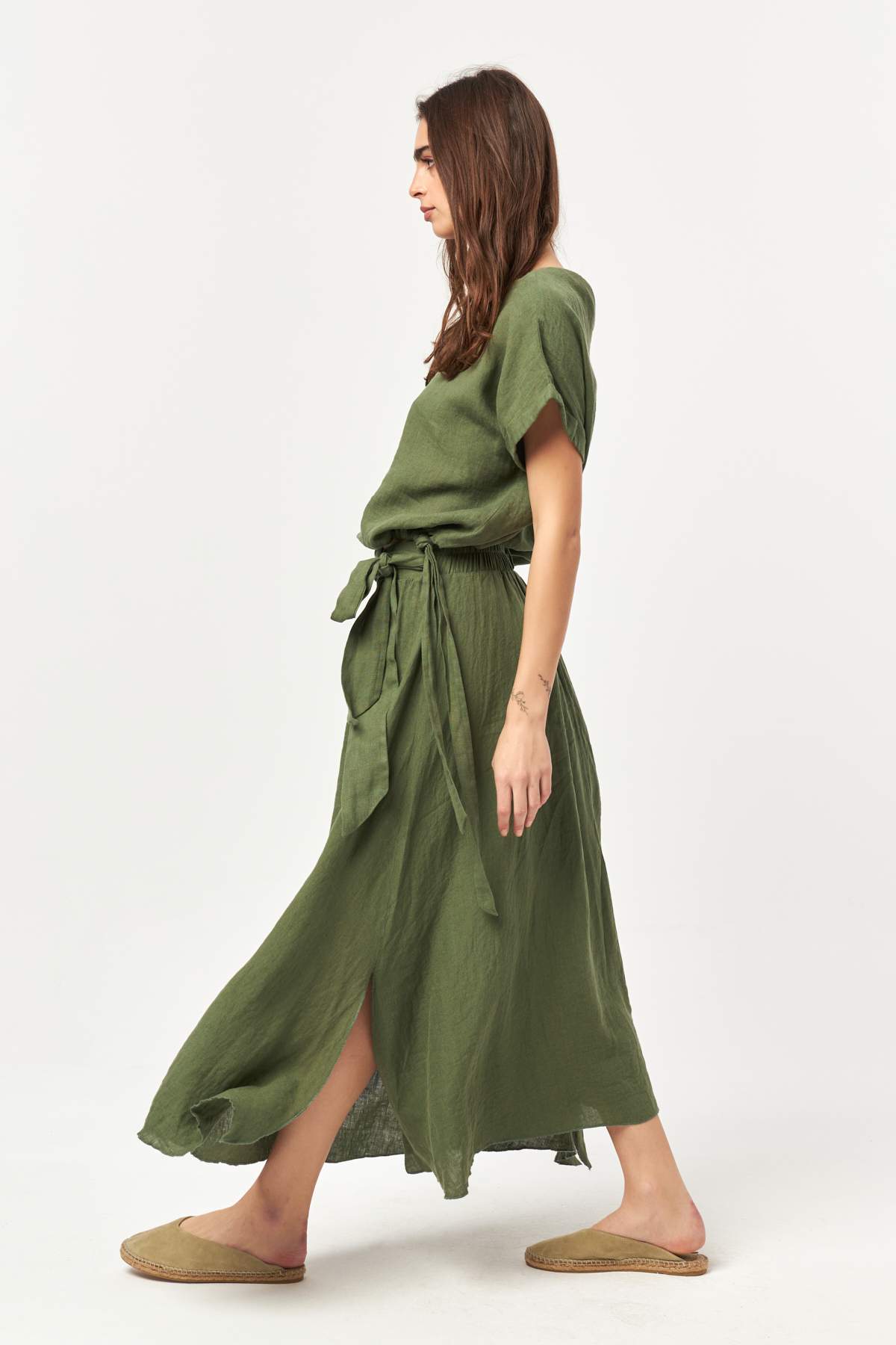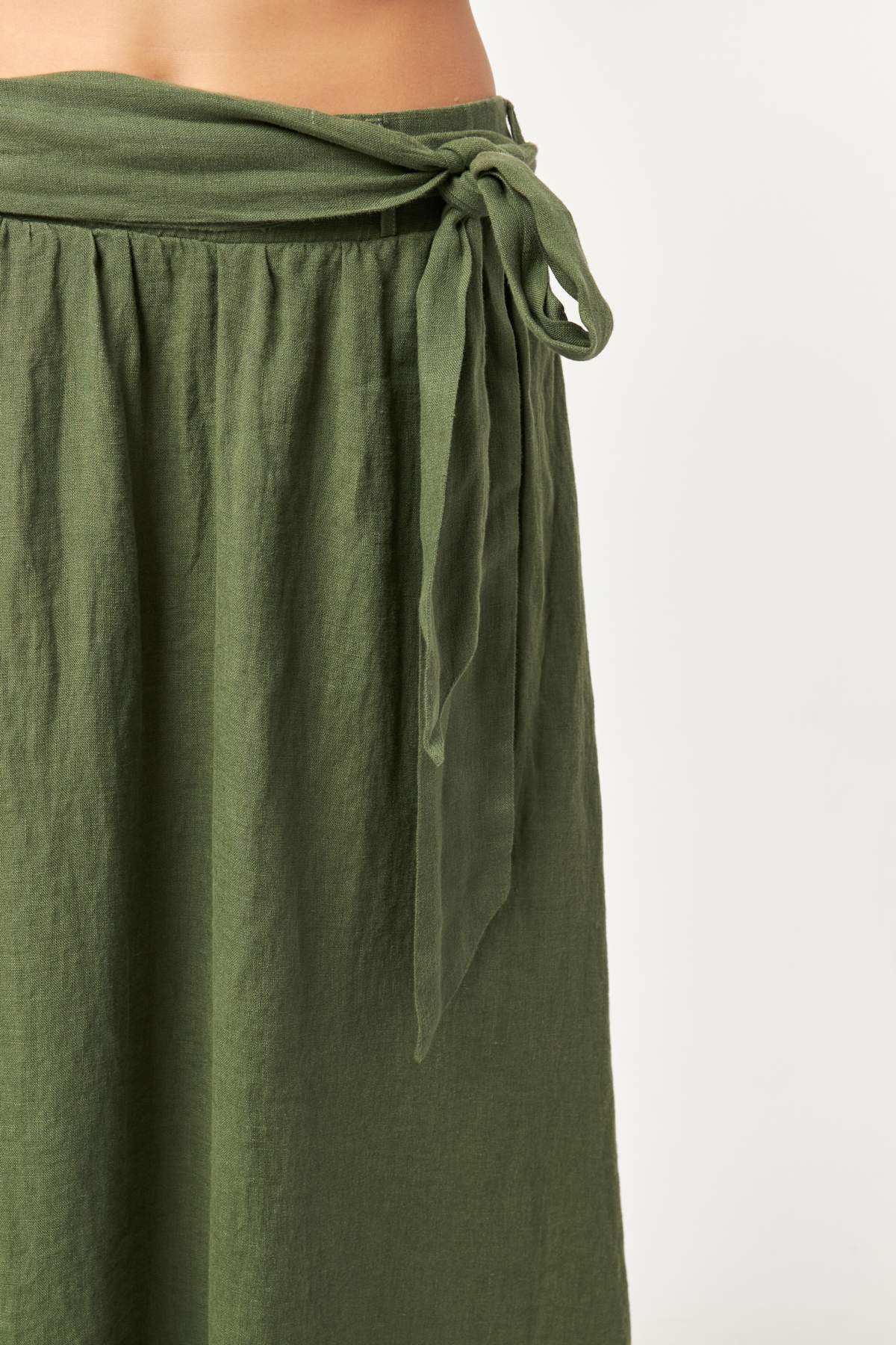 Rendered in a natural khaki tone, this linen skirt reflects an earthy, effortless summer attitude. The lightweight, breathable linen drapes softly with movement, while the adjustable waist tie offers a comfortable and flexible fit. A subtle side slit enhances ease and fluidity, making it a versatile piece for everyday wear and relaxed city styling.