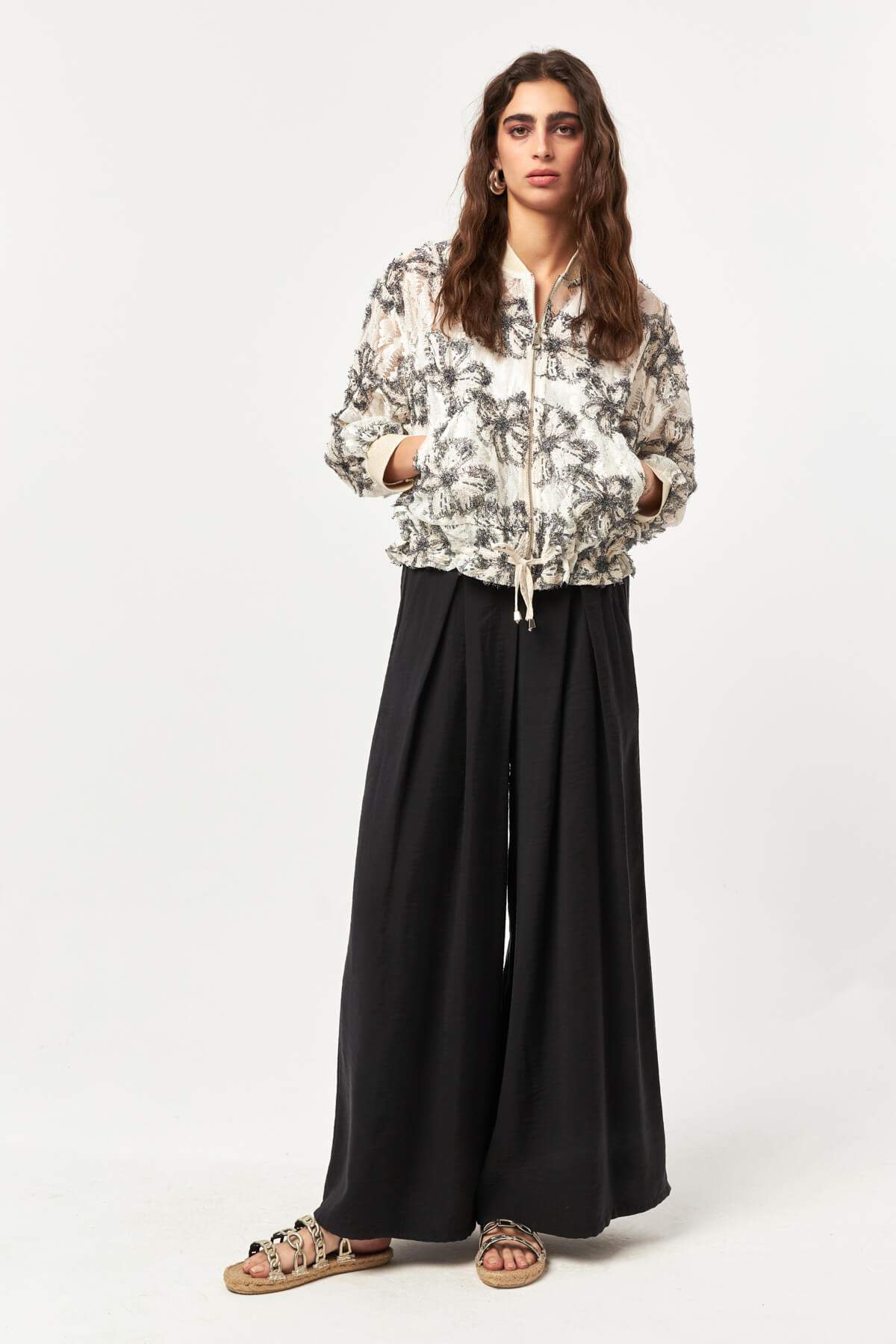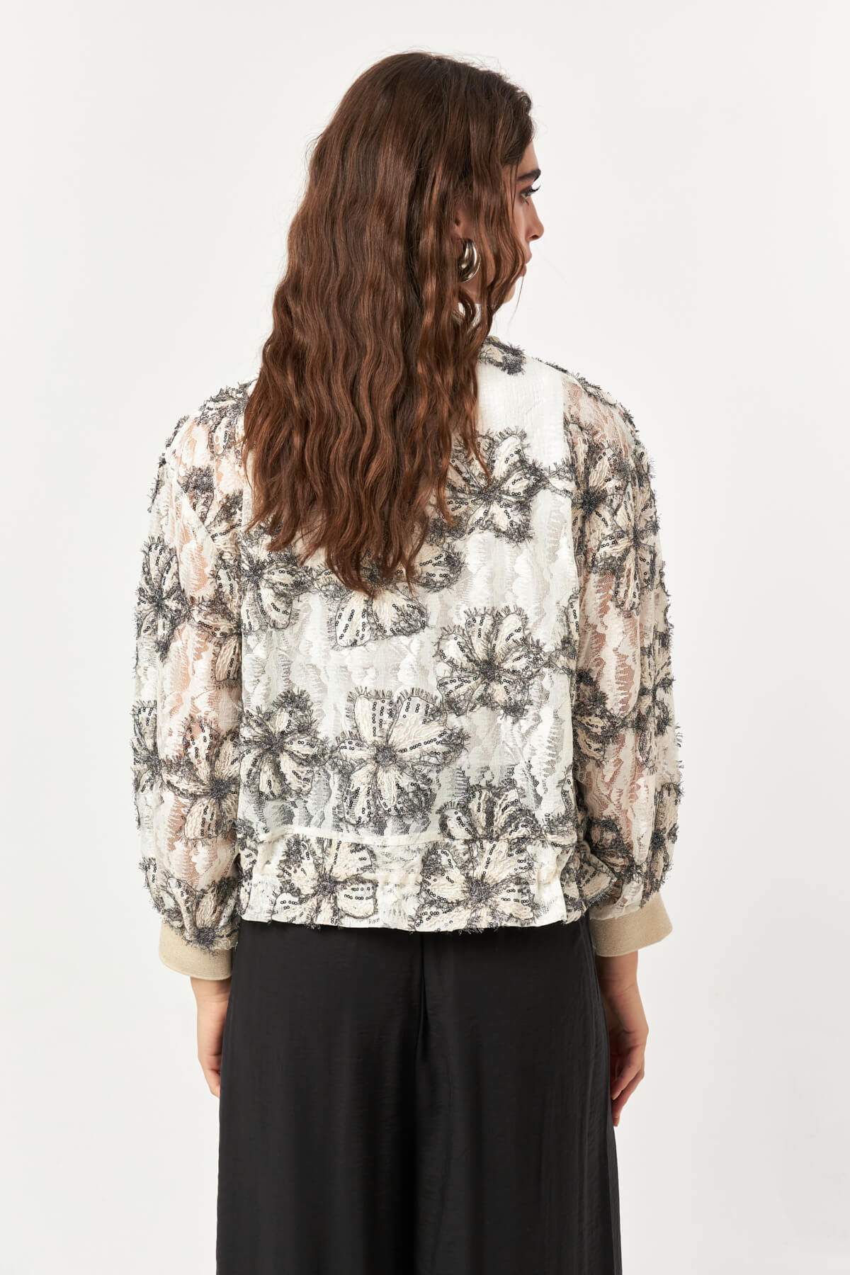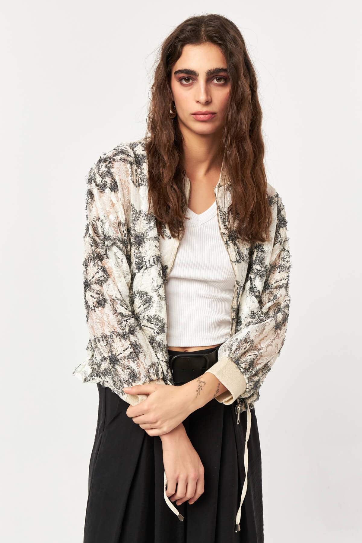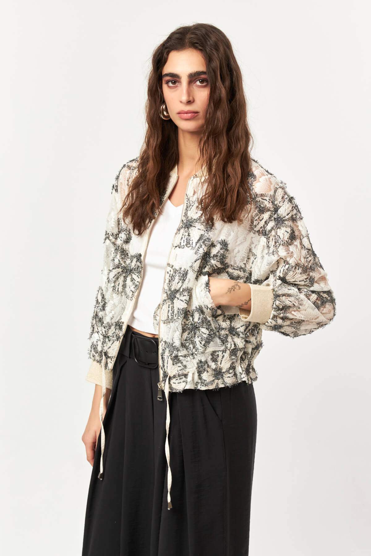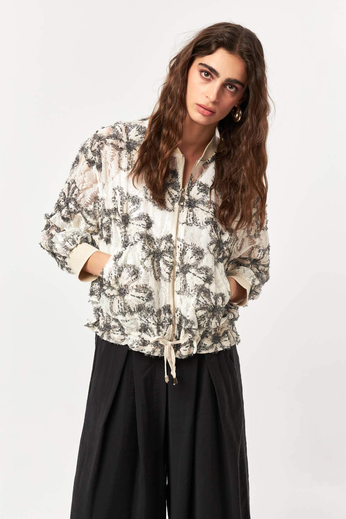 Crafted from an intricate lace fabric, the Lace Bloom Drawstring Jacket brings a refined texture to a modern bomber silhouette. The all-over floral lace pattern creates a delicate, semi-sheer appearance, while the front zipper and adjustable drawstring hem add a contemporary and functional touch. Designed in a black and ecru color palette, this lightweight jacket transitions effortlessly from daytime styling to elevated evening looks.