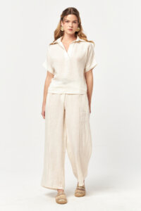 Clean and airy, the Ecru tone enhances the natural lightness of linen with a soft, sun-washed feel. The polo-inspired open collar adds an effortless elegance, making it a timeless choice for warm days and relaxed summer styling.