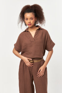 Warm and earthy in tone, this Nesquik shade highlights the natural texture of linen with a soft, lived-in feel. The polo-inspired open collar adds a relaxed sophistication, making it an effortless choice for warm days and timeless summer looks.