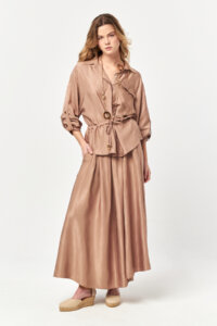 Warm cocoa tones blend with a fluid drape and gently defined waist, crafted in sustainable Ecovero™ viscose for a naturally polished look.