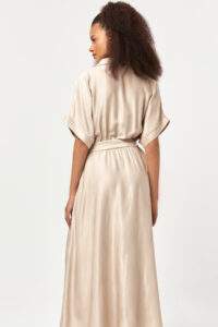 Soft stone tones highlight a fluid long silhouette, finished with a waist-defining belt and side pockets for an effortlessly polished, everyday look.