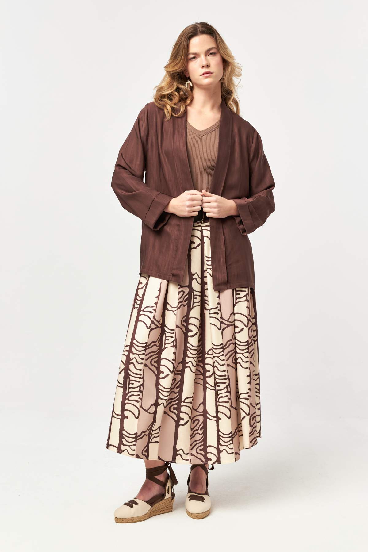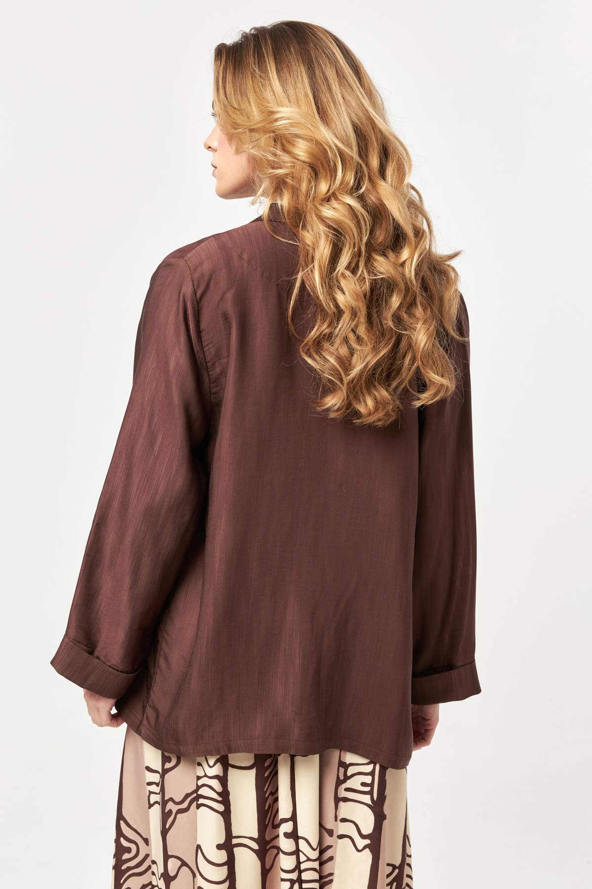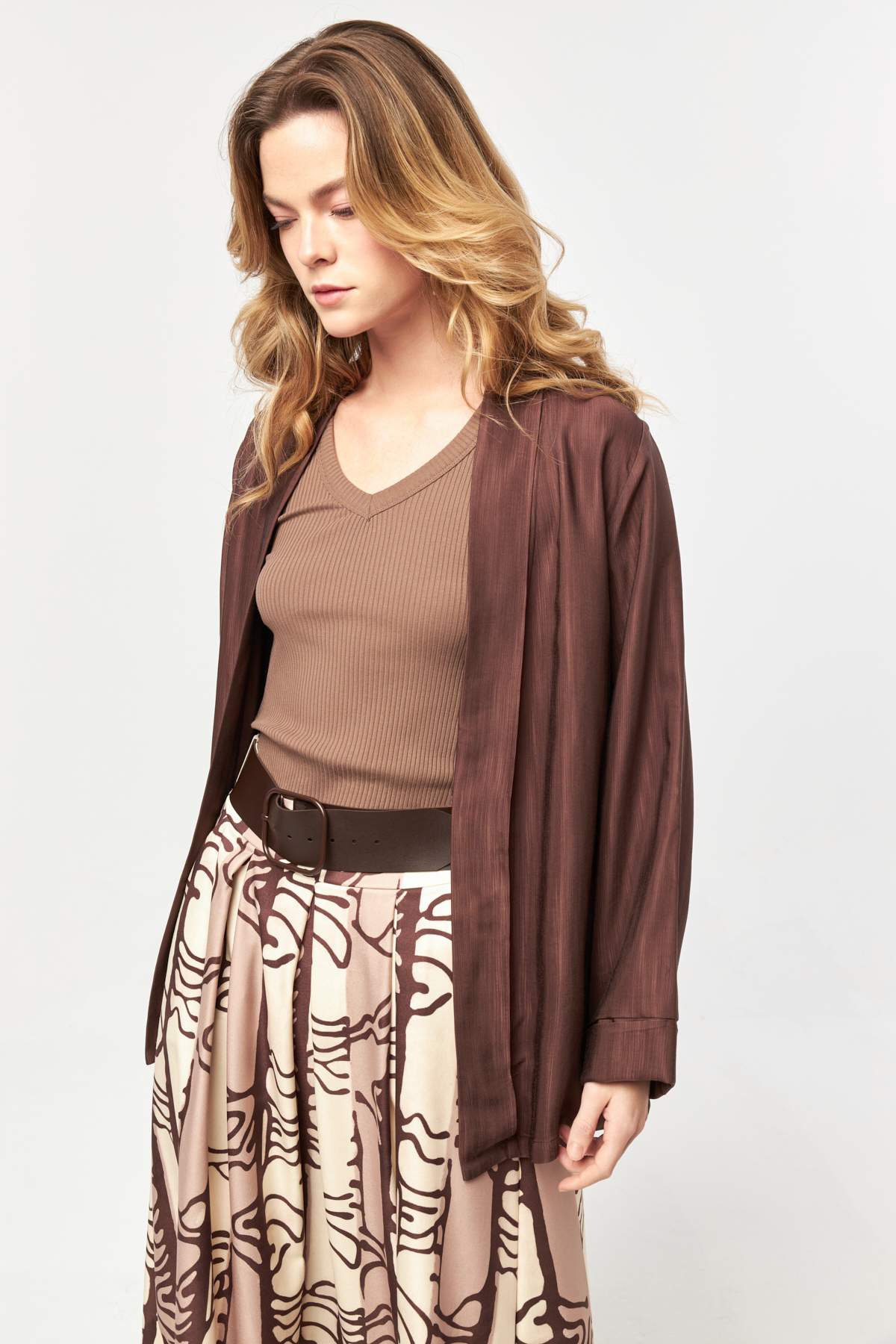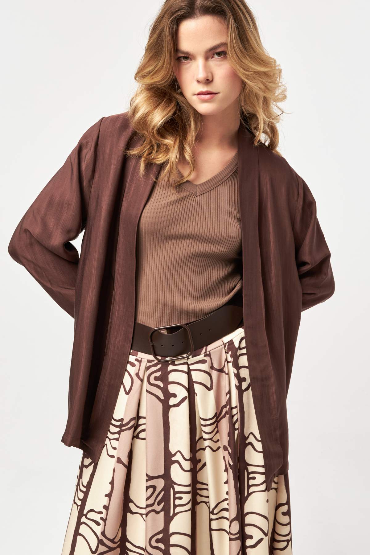 Fluid brown tones meet a relaxed open-front silhouette, offering lightweight layering with a soft drape for an effortlessly polished look.