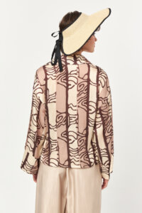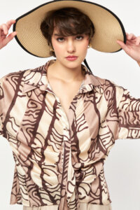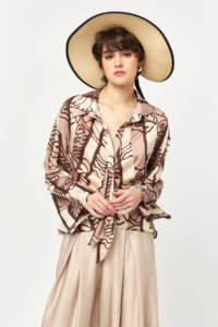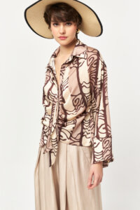 Designed with a fluid silhouette and a feminine tie-front detail, this shirt is crafted from recycled polyester for a lightweight and airy feel. The brown stripe print adds movement and depth, making it an effortless yet refined piece for coordinated set styling.