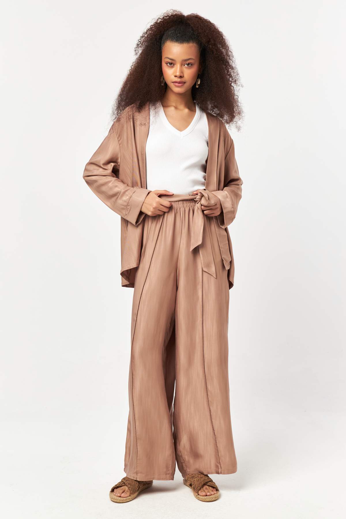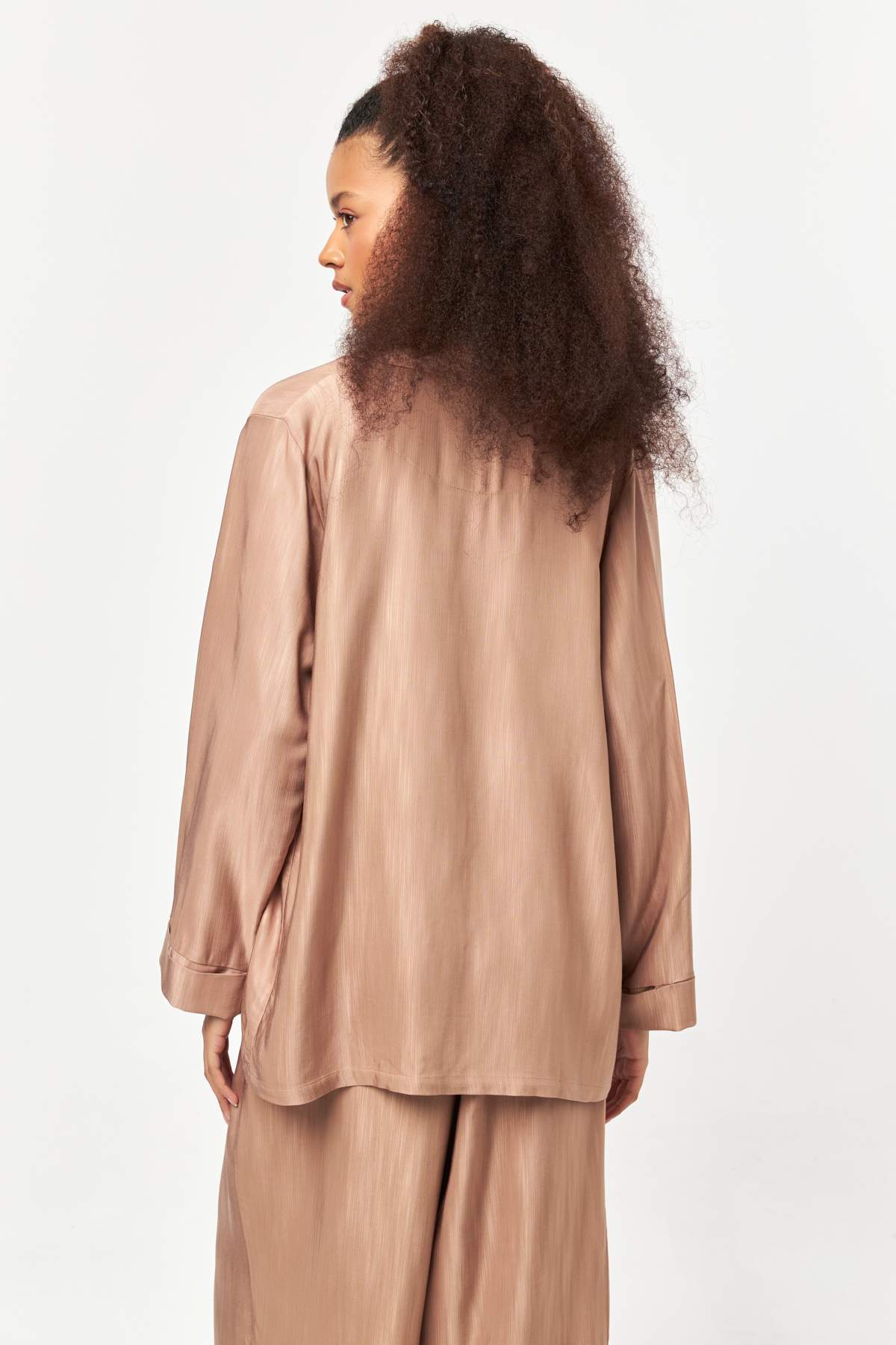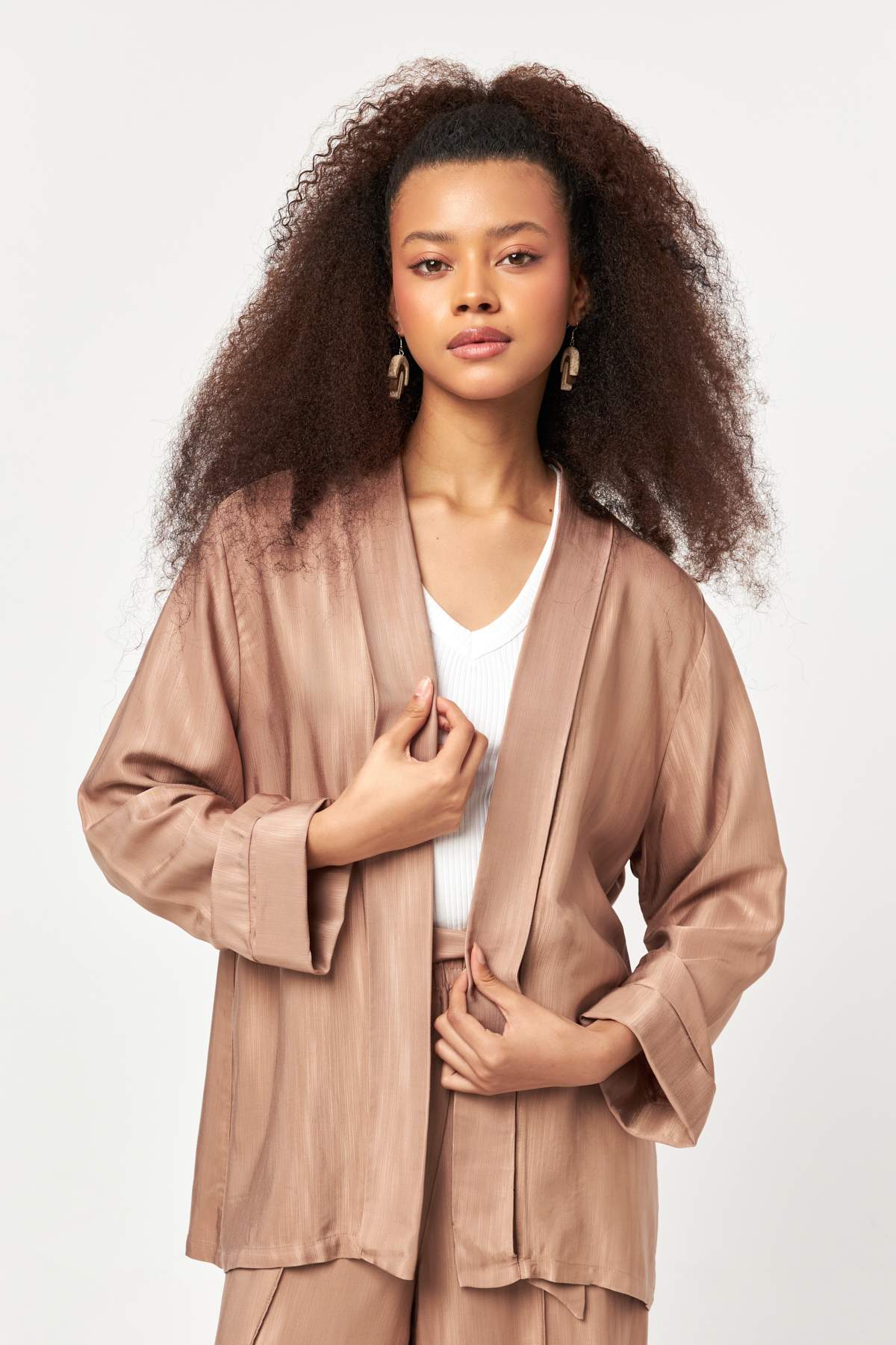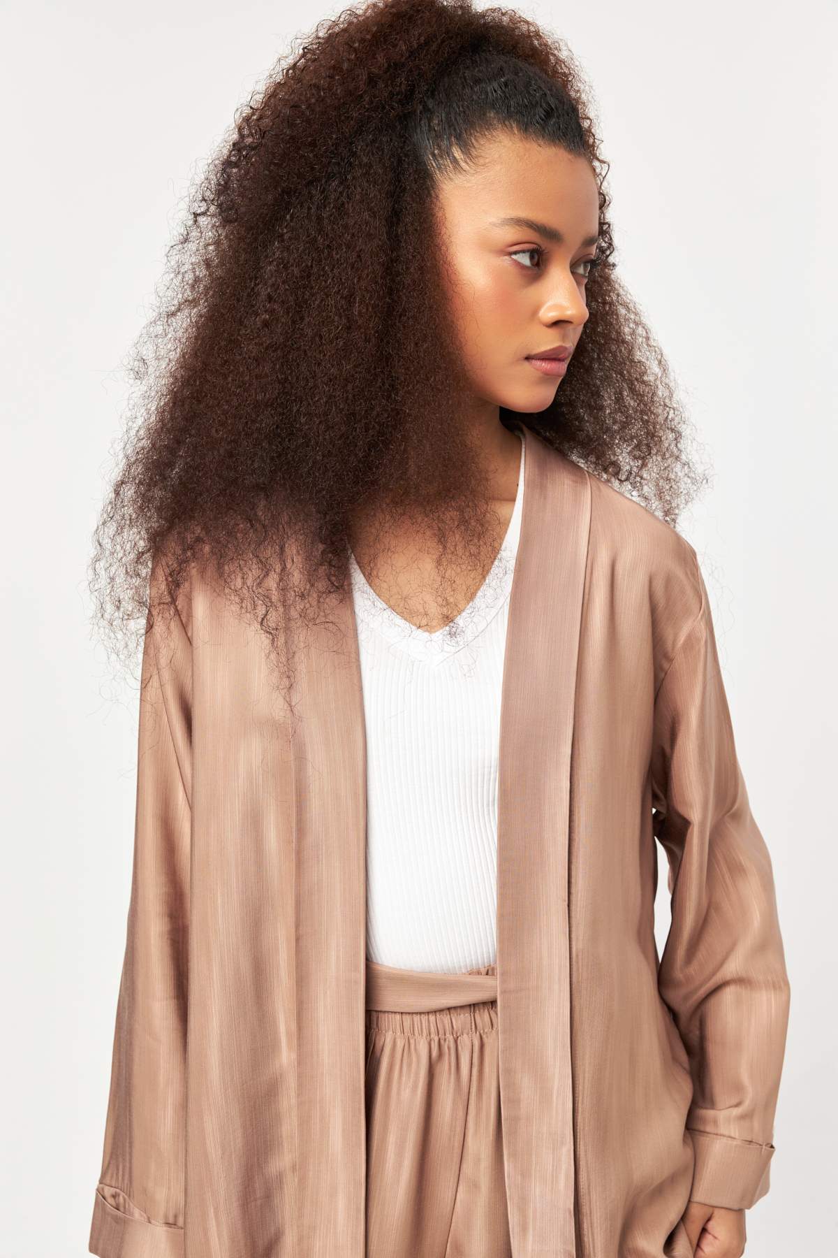 Warm cocoa tones flow through a relaxed open-front silhouette, finished with a soft drape for effortless layering and refined everyday style.