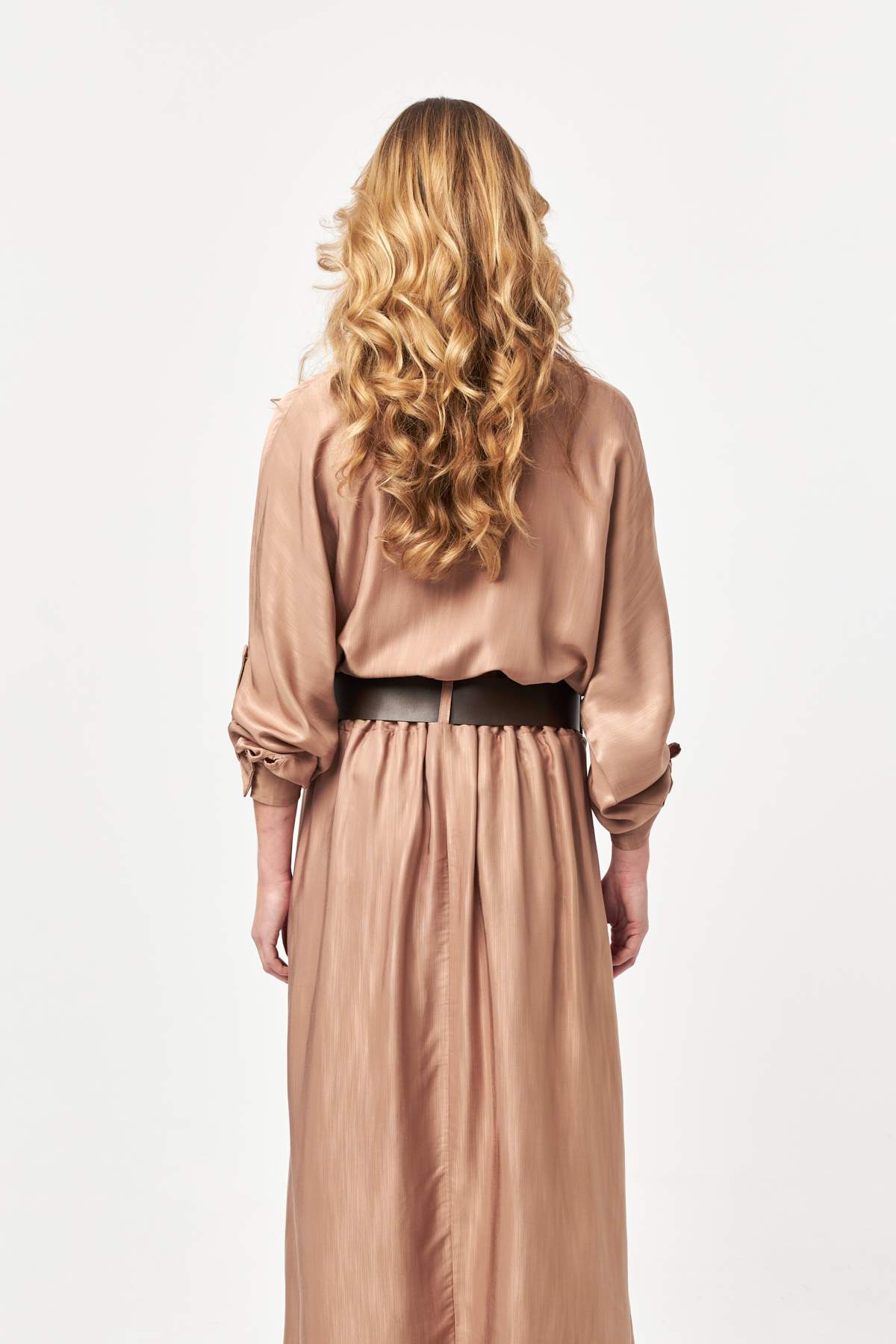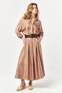 Fluid cocoa tones meet a softly flared long silhouette, finished with side pockets and a waist-defining belt for effortless movement and refined comfort.